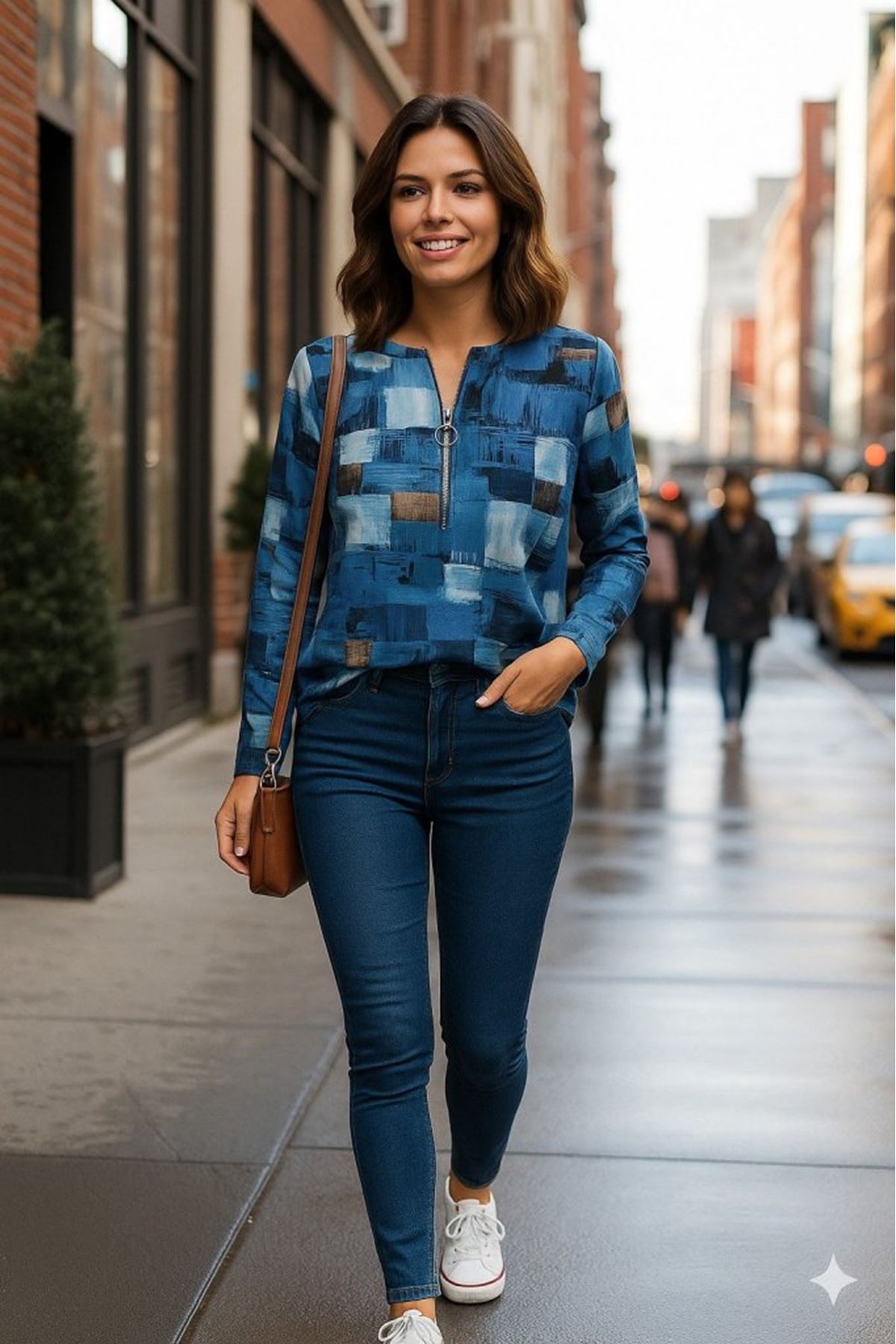 Kadın Uzun Kollu Yakadan Fermuarlı Kot Görünüm Desenli Uzun Modal Bluz