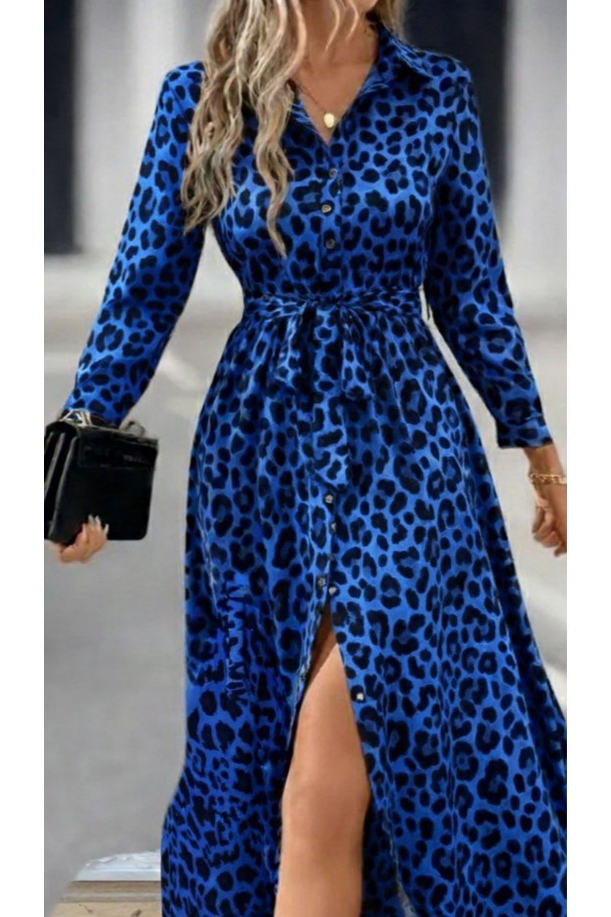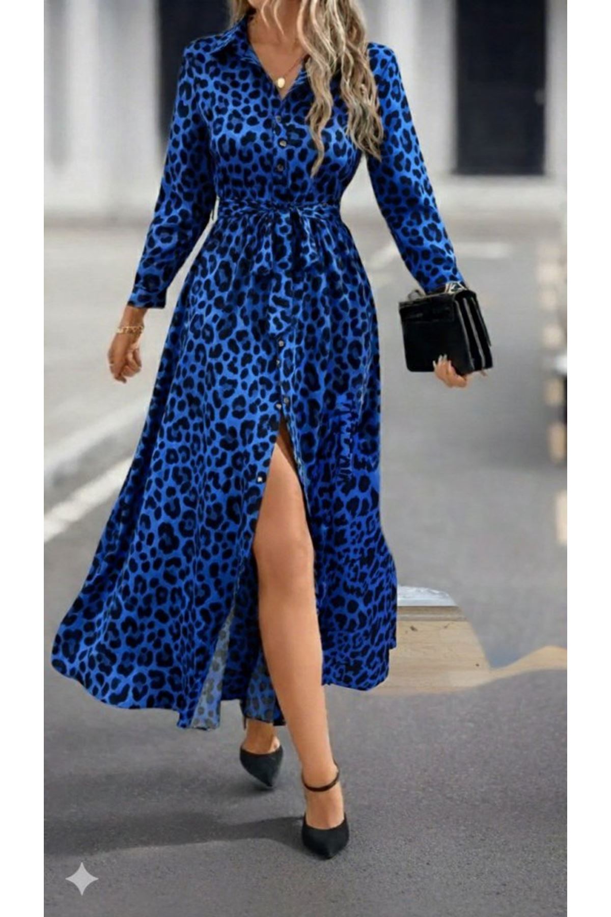 Kadın Uzun Kollu Yakalı Belden Kuşaklı Leopar Desenli Modal Uzun Elbise