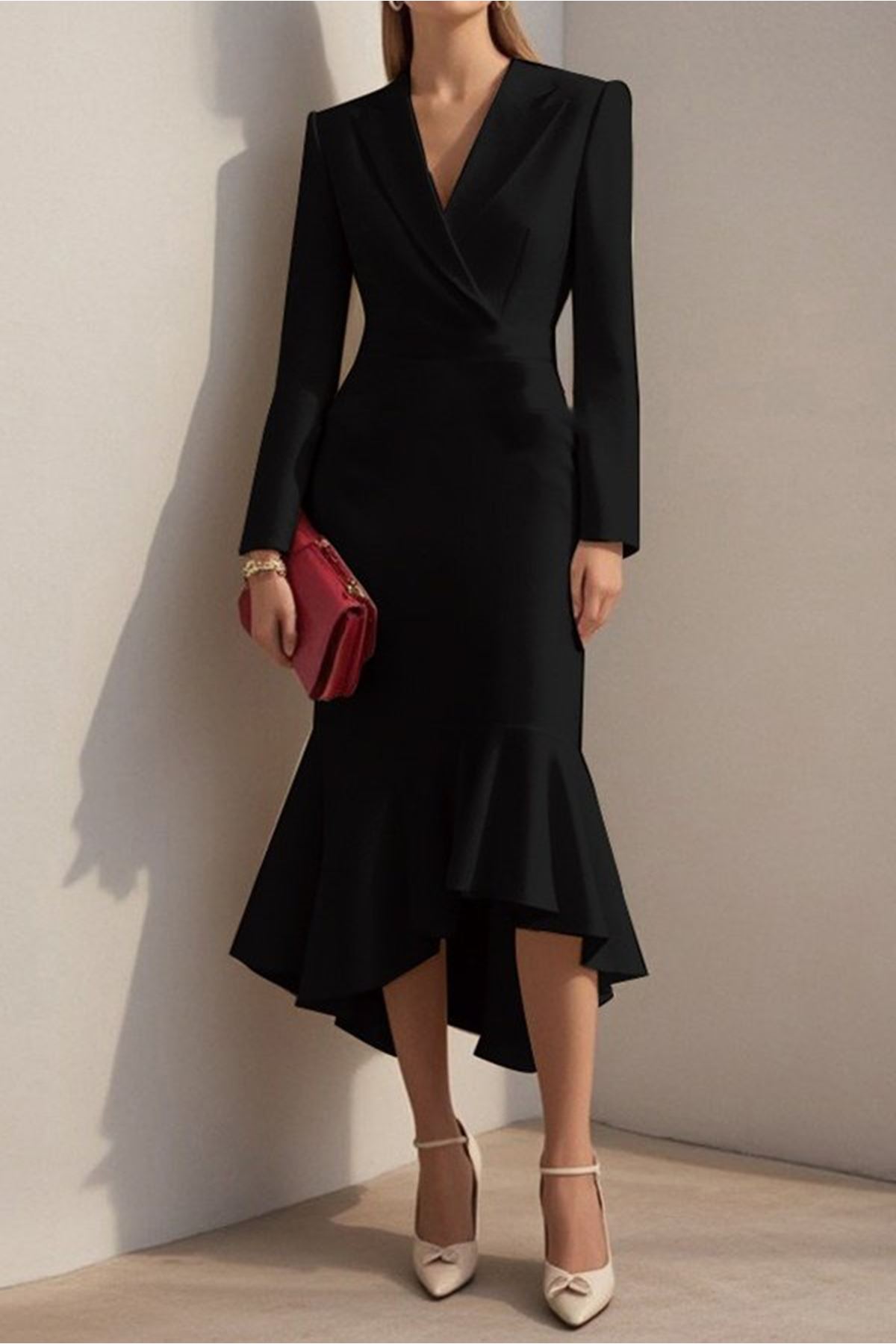 Kadın Uzun Kollu Yakalı Belden Oturtmalı Midi Ithal Krep Elbise