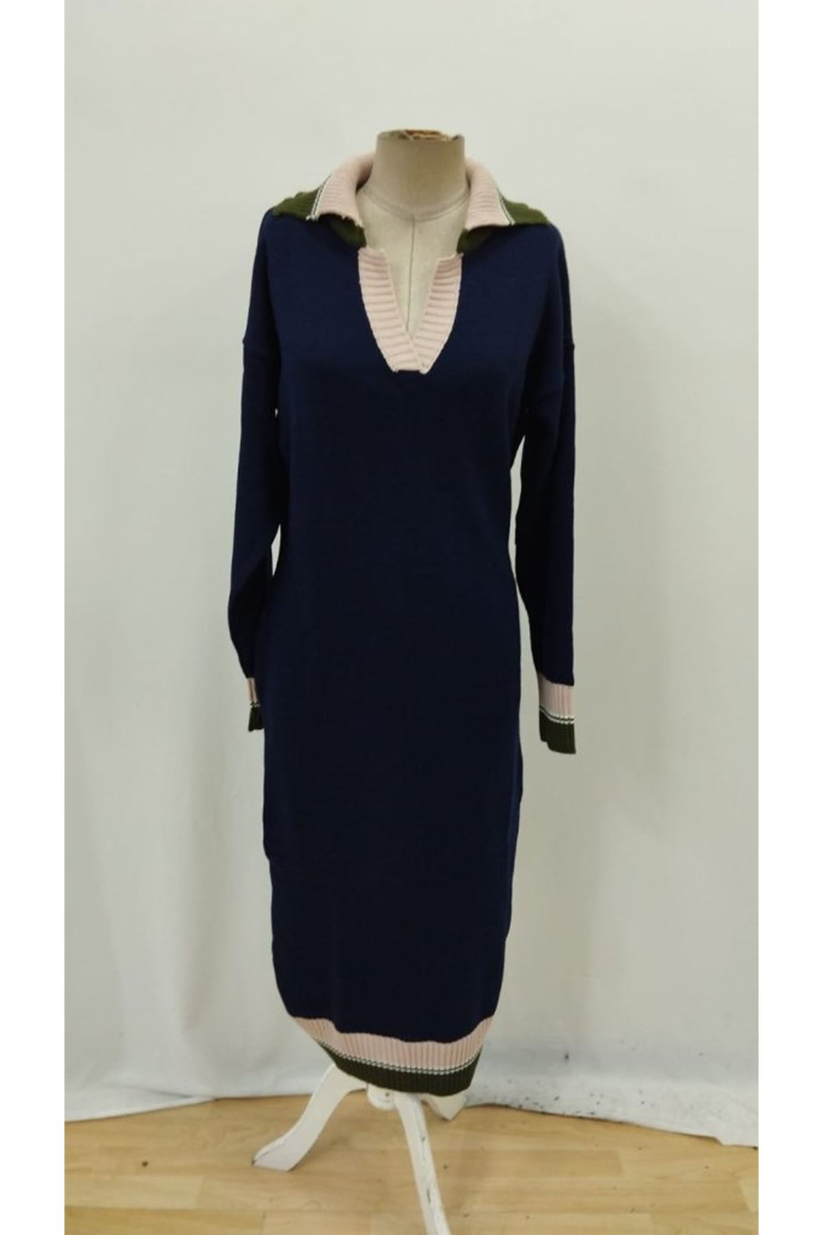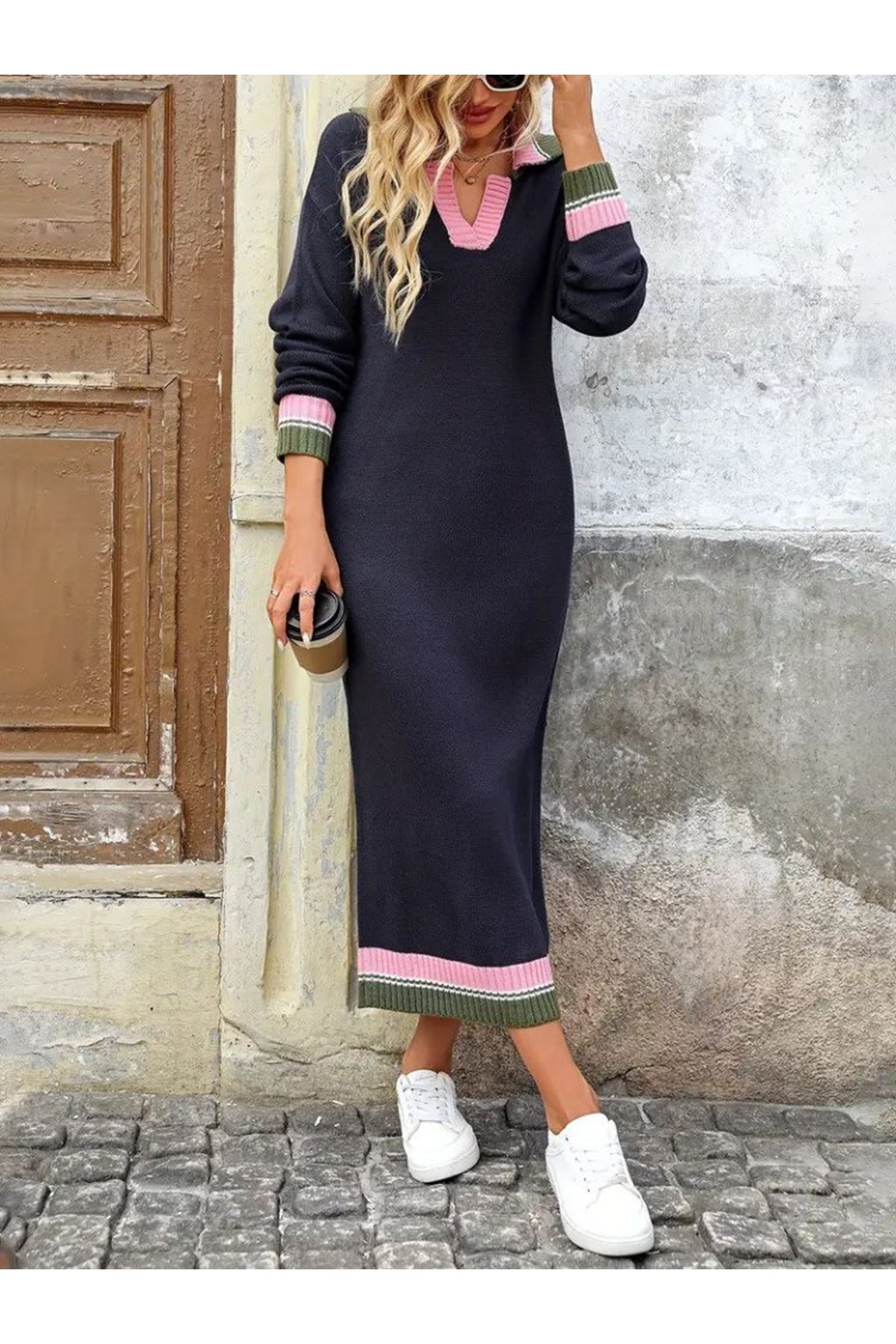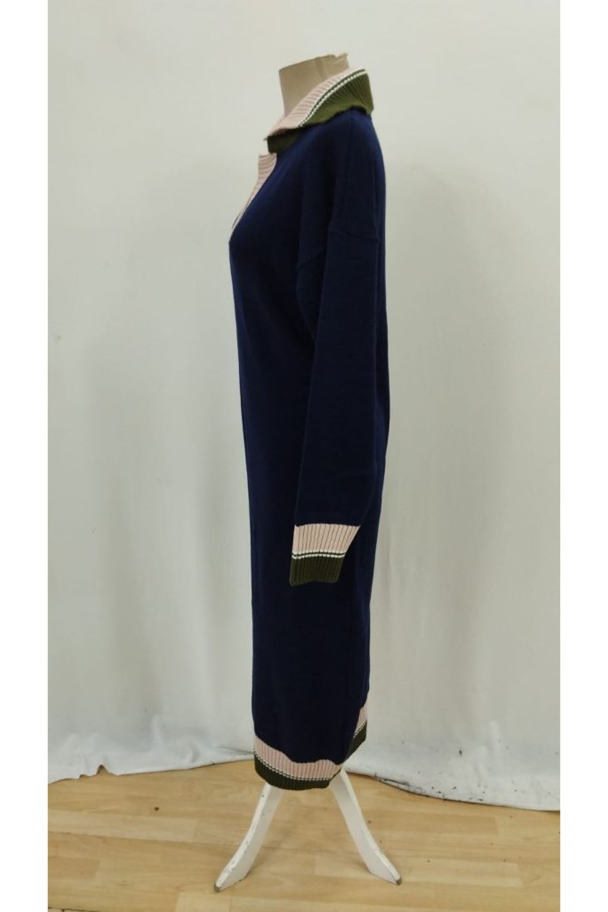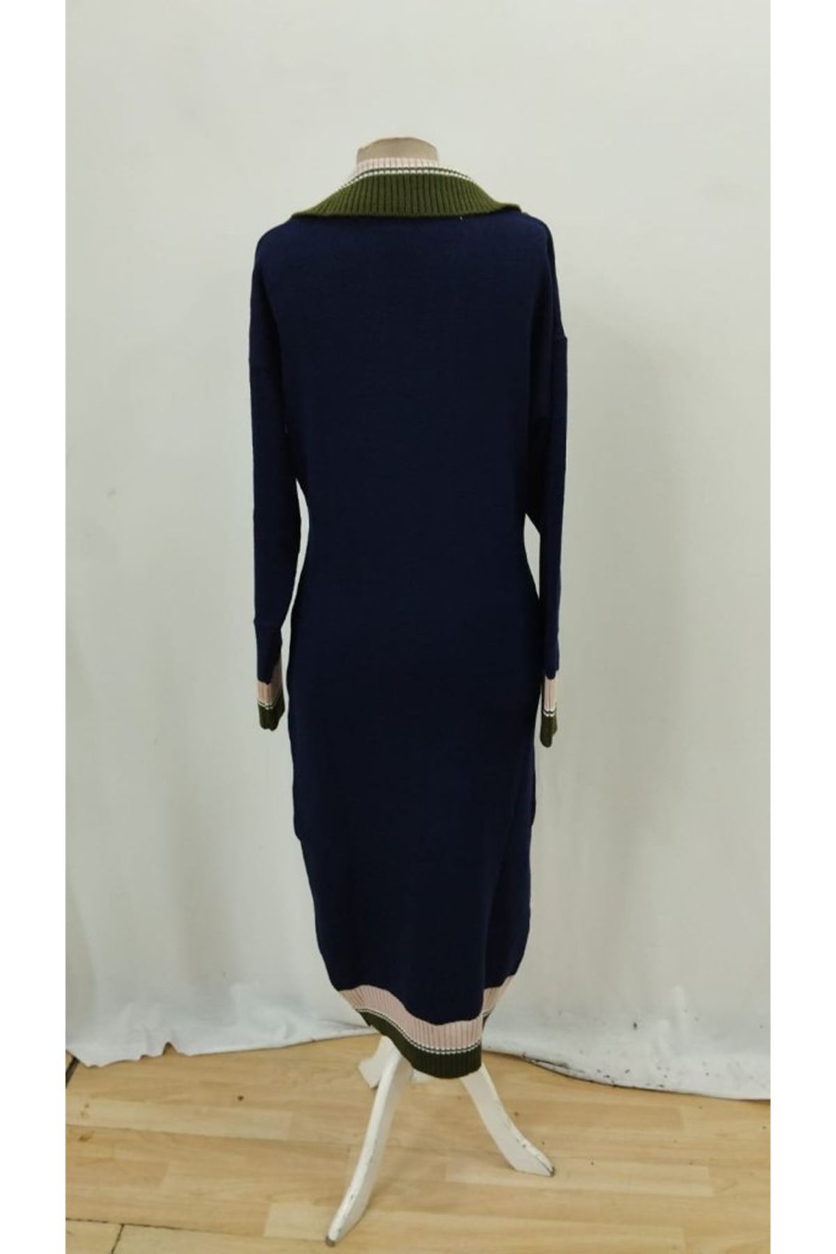 Kadın Uzun Kollu Yakalı çok Renkli Triko Uzun Elbise