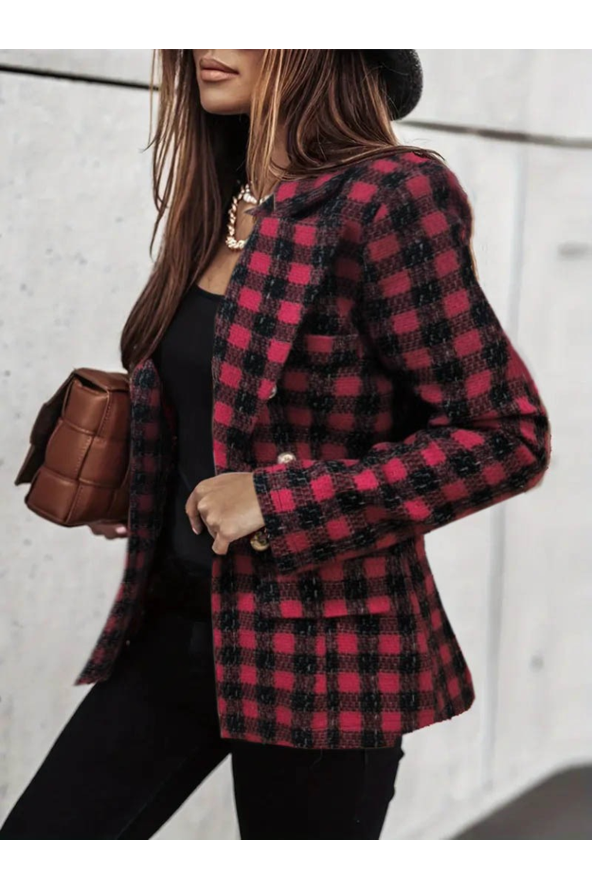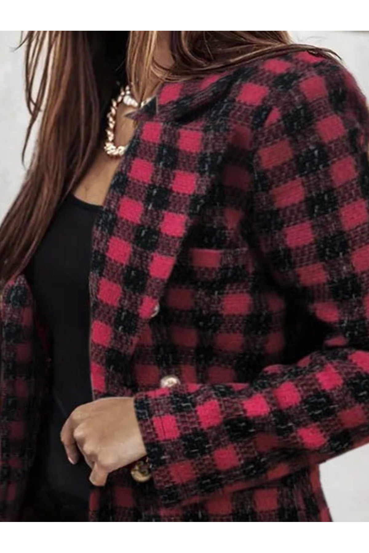 Kadın Uzun Kollu Yakalı Kare Desenli Ekoseli Düğmeli Ceket