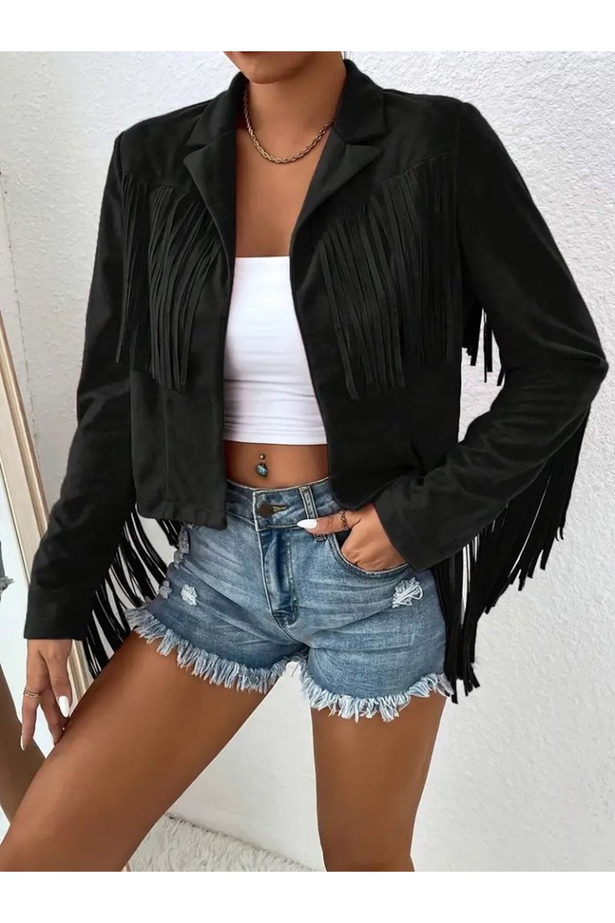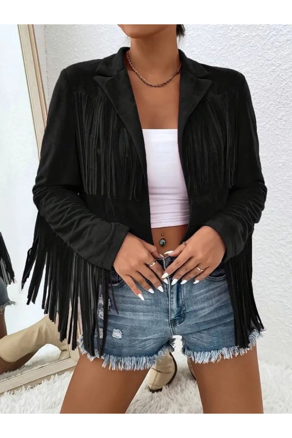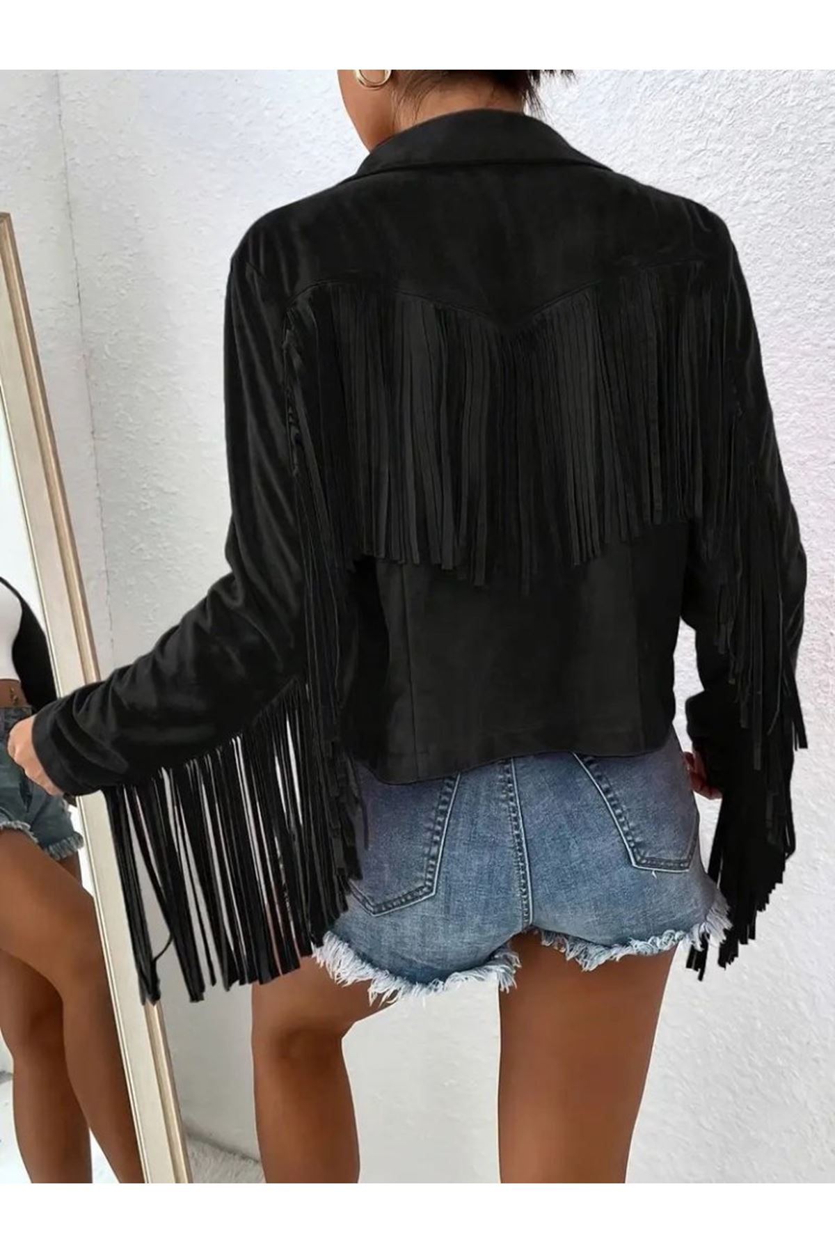 Kadın Uzun Kollu Yakalı Kısa Püsküllü Süet Ceket