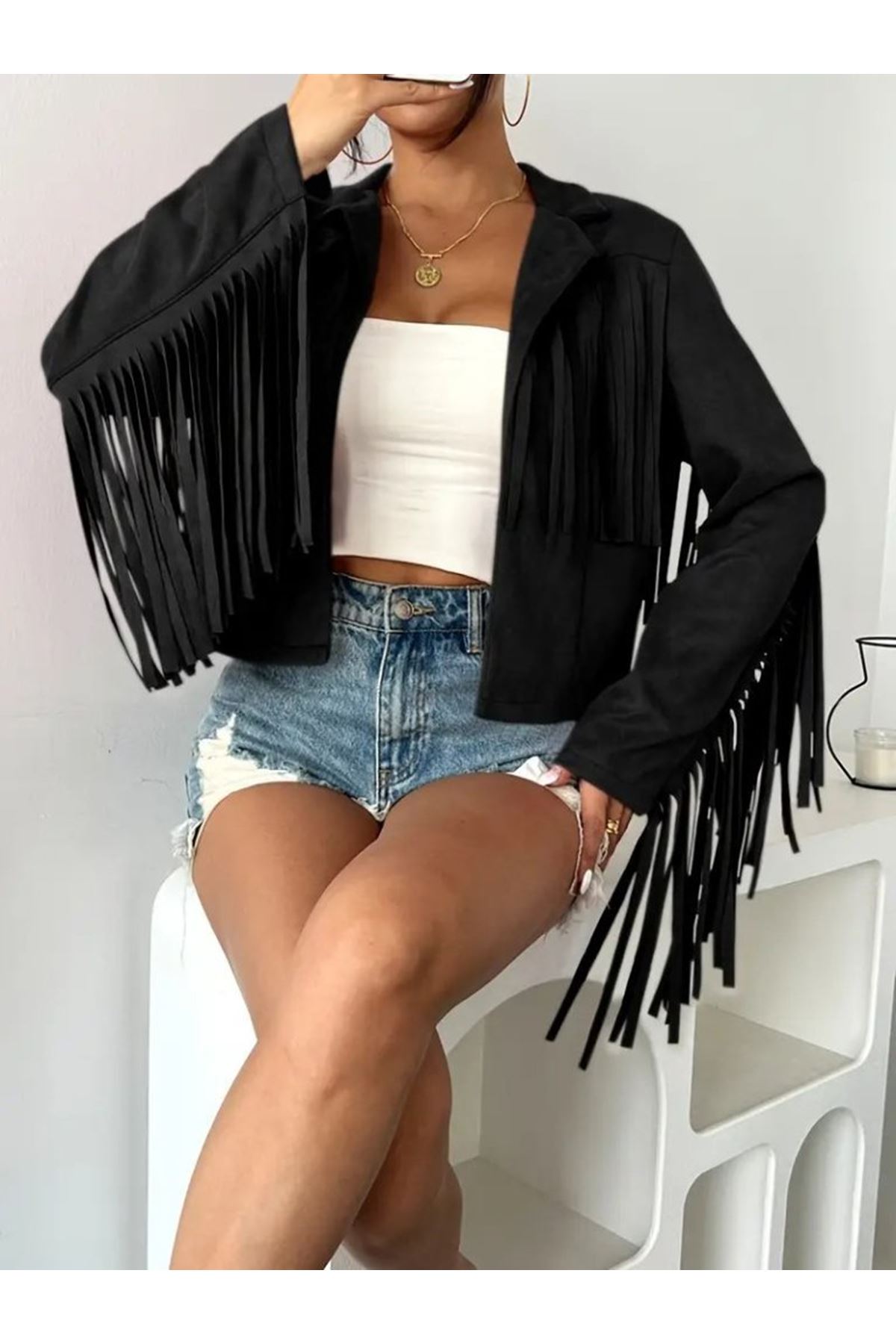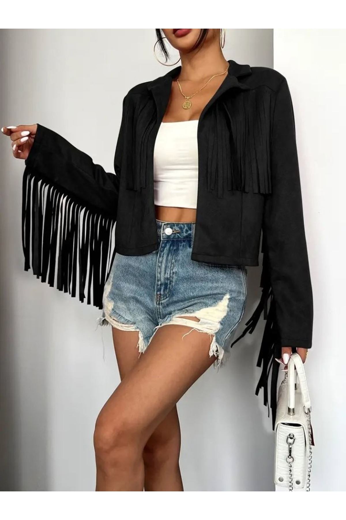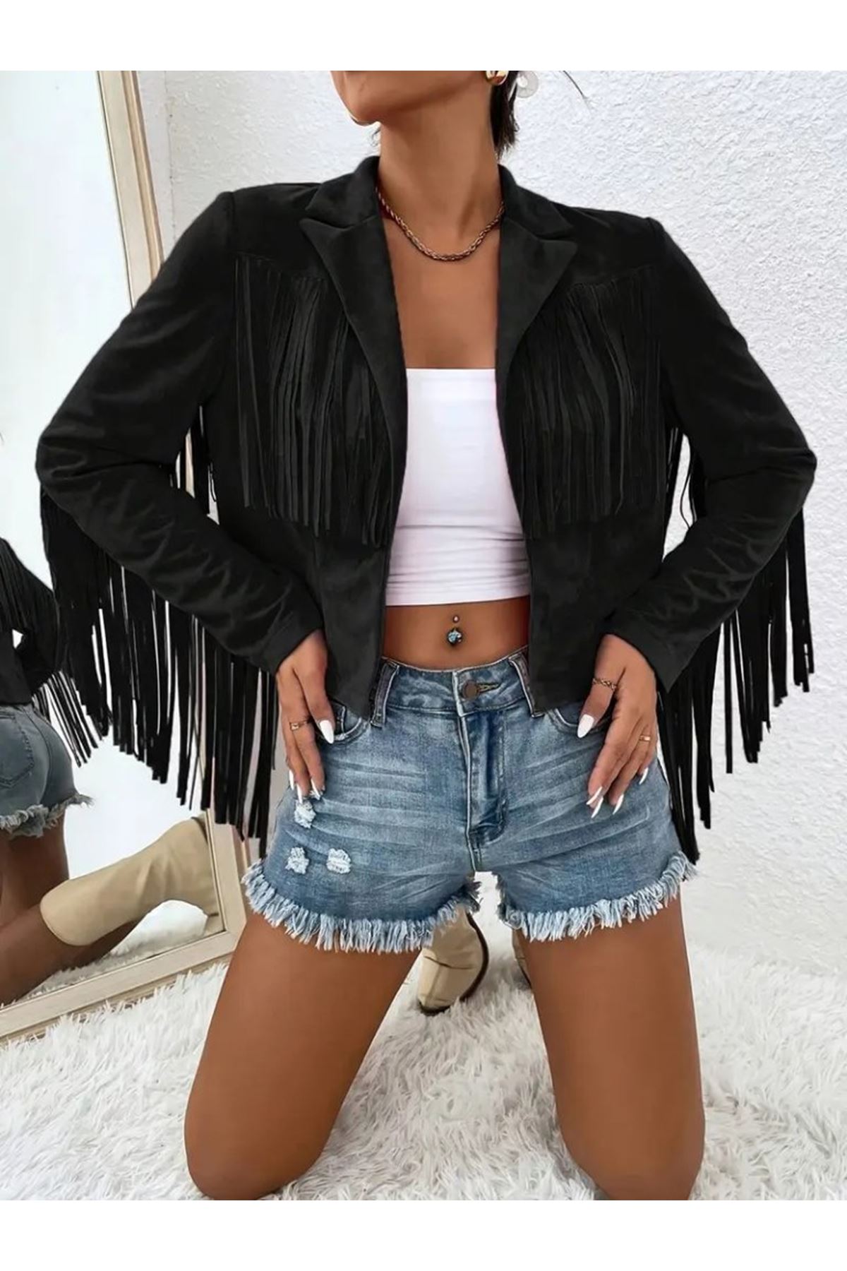 Kadın Uzun Kollu Yakalı Kısa Püsküllü Süet Ceket