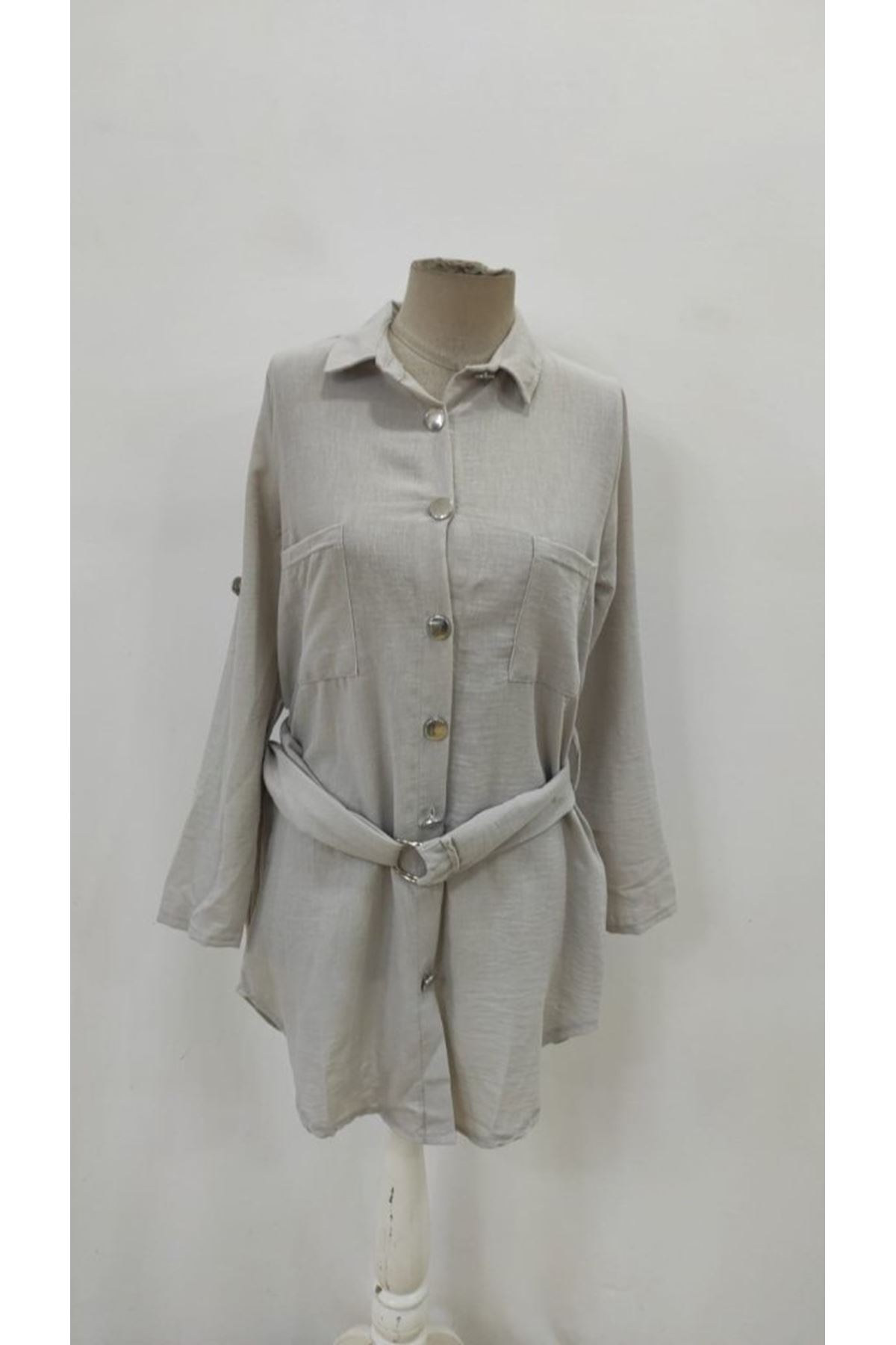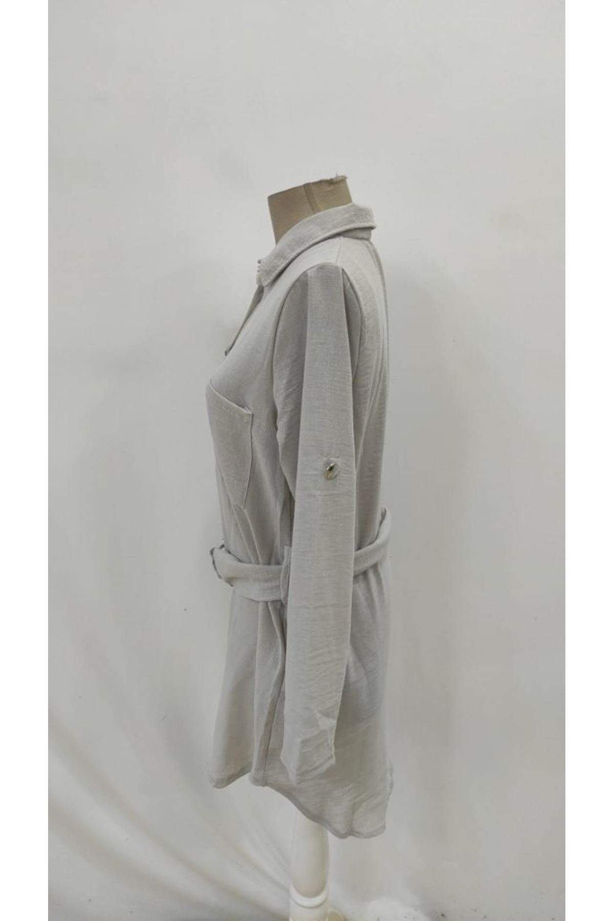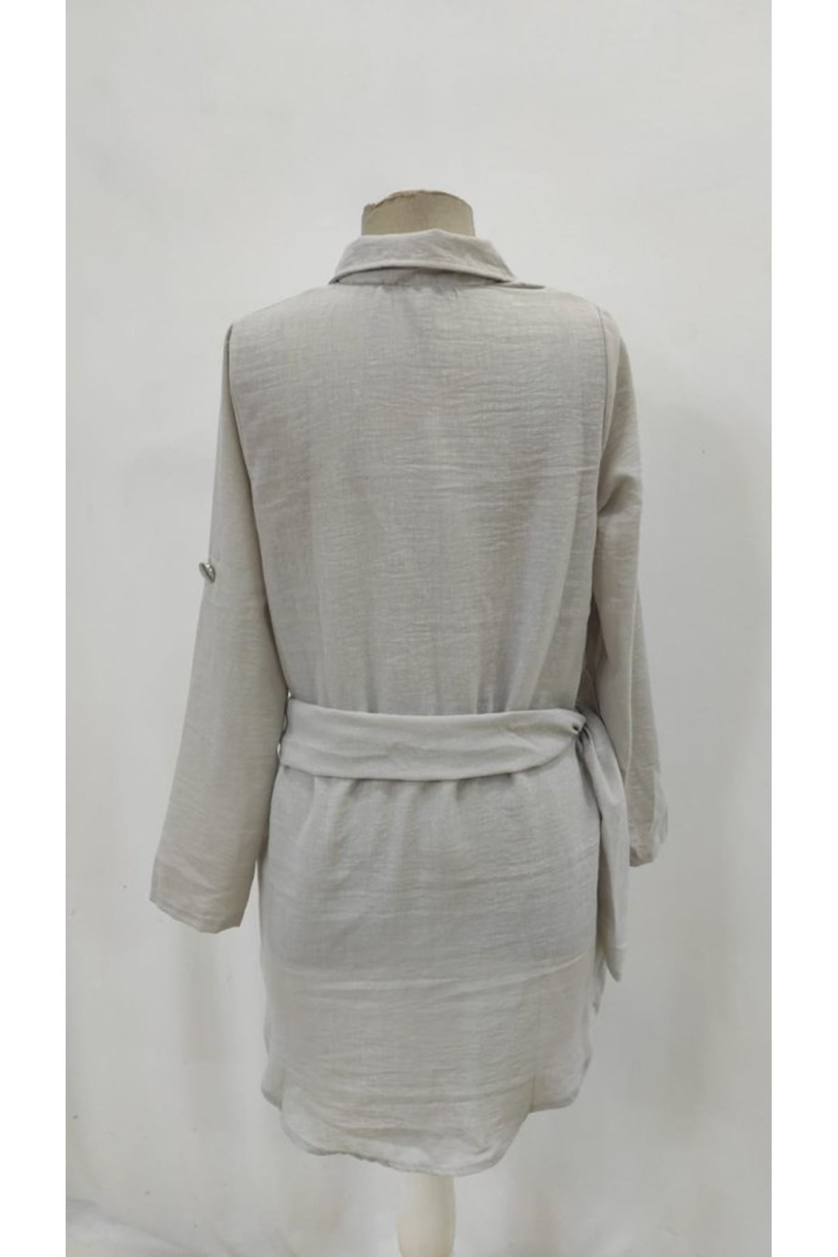 Kadın Uzun Kollu Yakalı önden Düğmeli Beli Kuşaklı Mini Ithal Keten Elbise