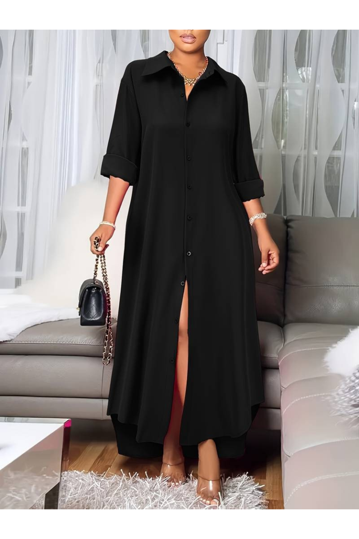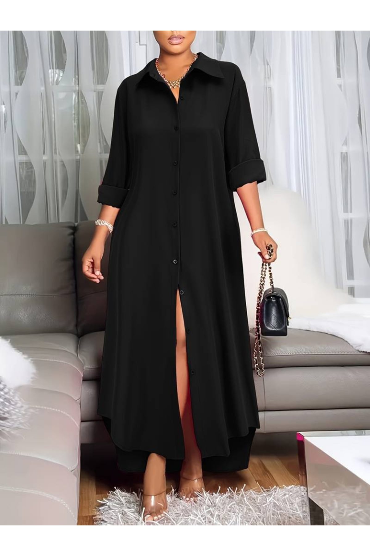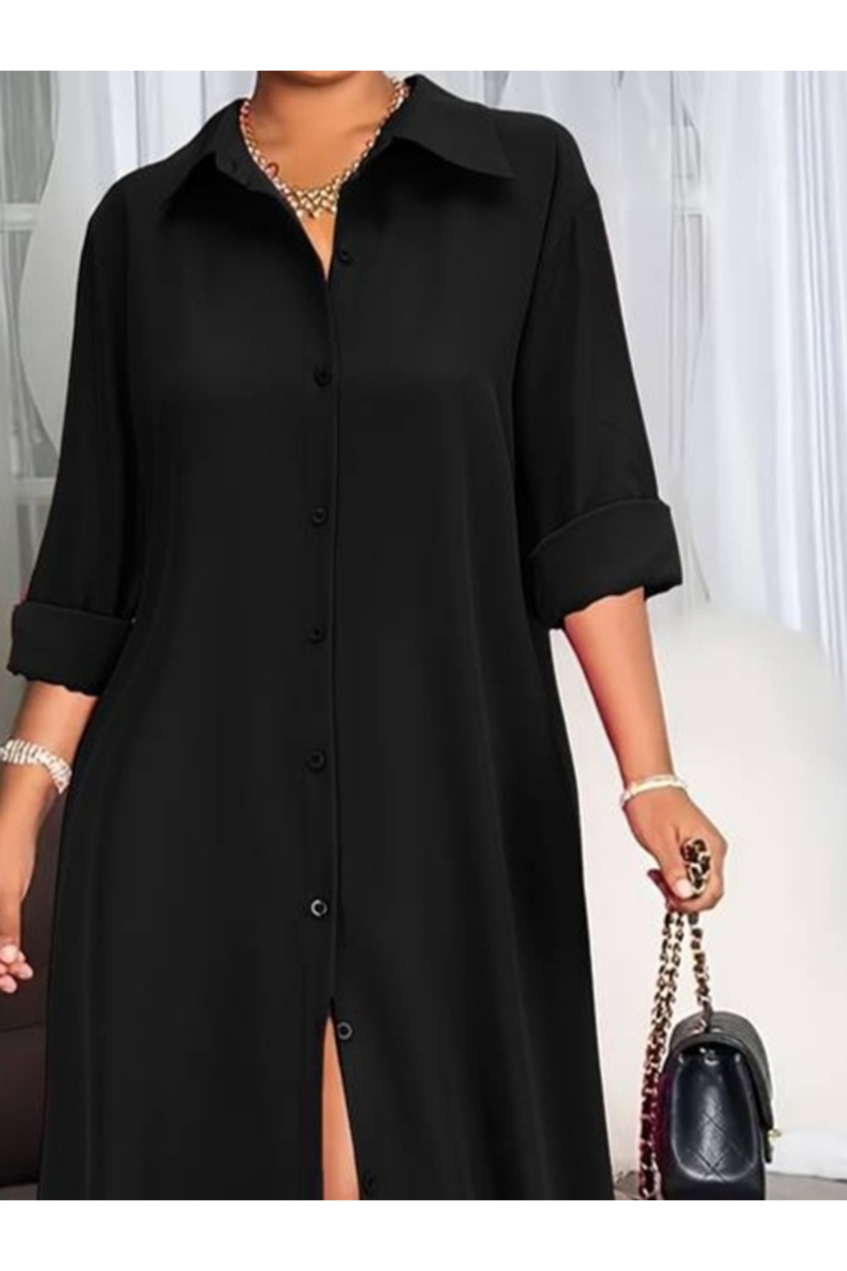 Kadın Uzun Kollu Yakalı önden Düğmeli Uzun Dokuma Elbise