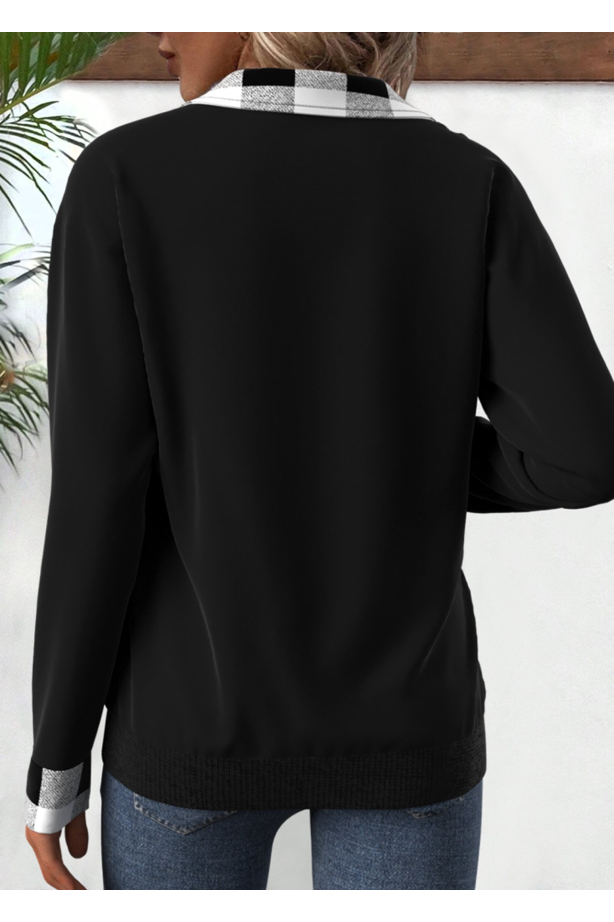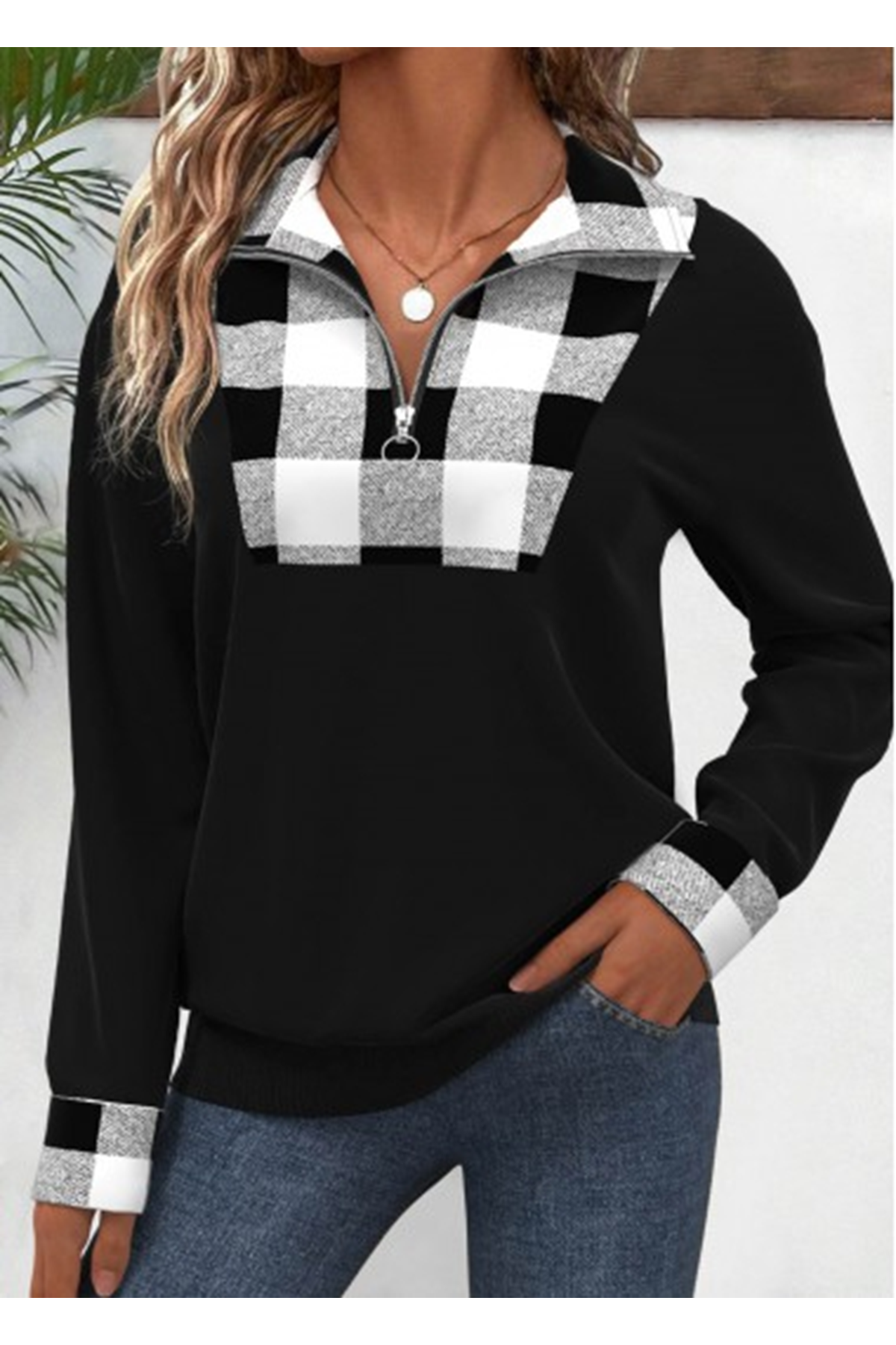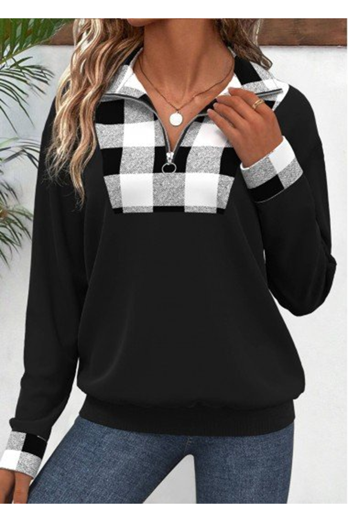 Kadın Uzun Kollu Yakalı önden Fermuarlı Ekose Detaylı Viskon Iki Iplik Bluz