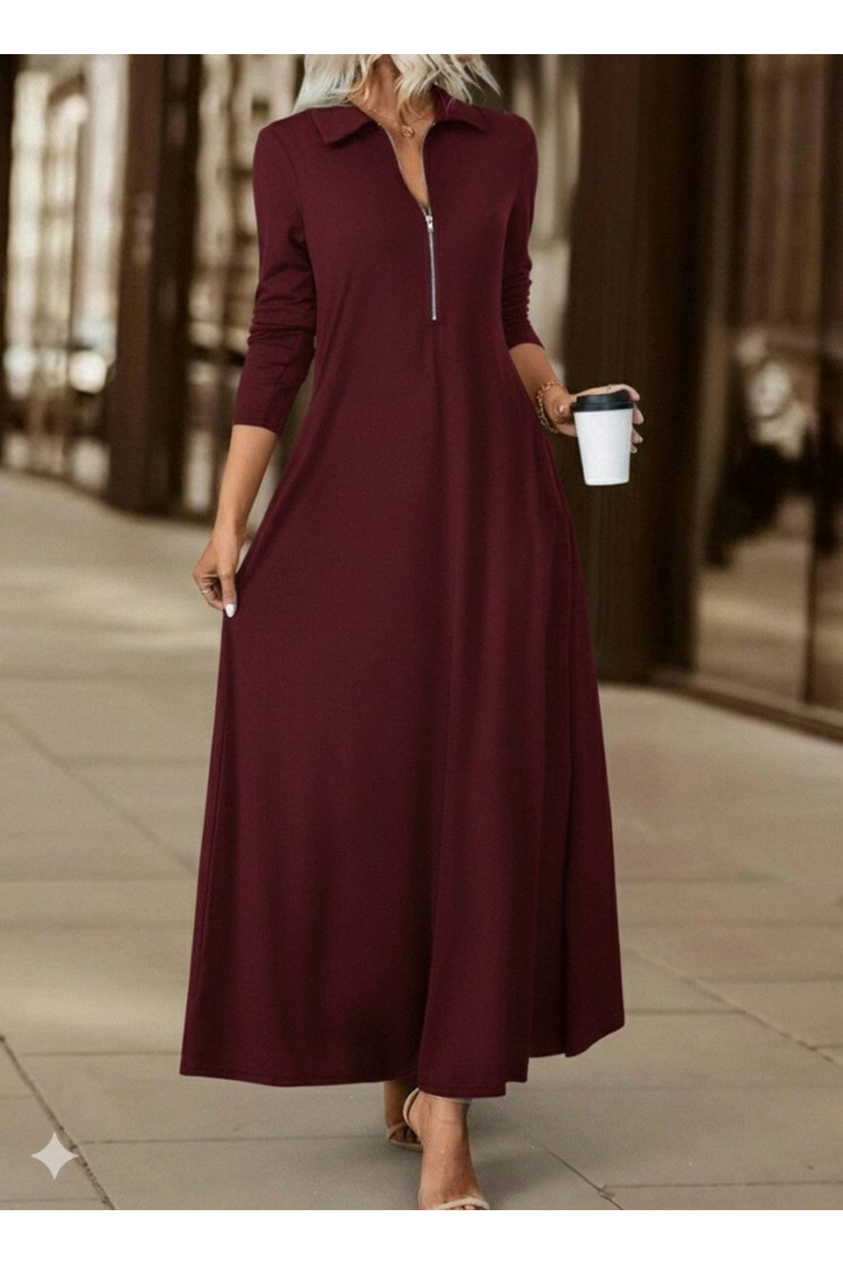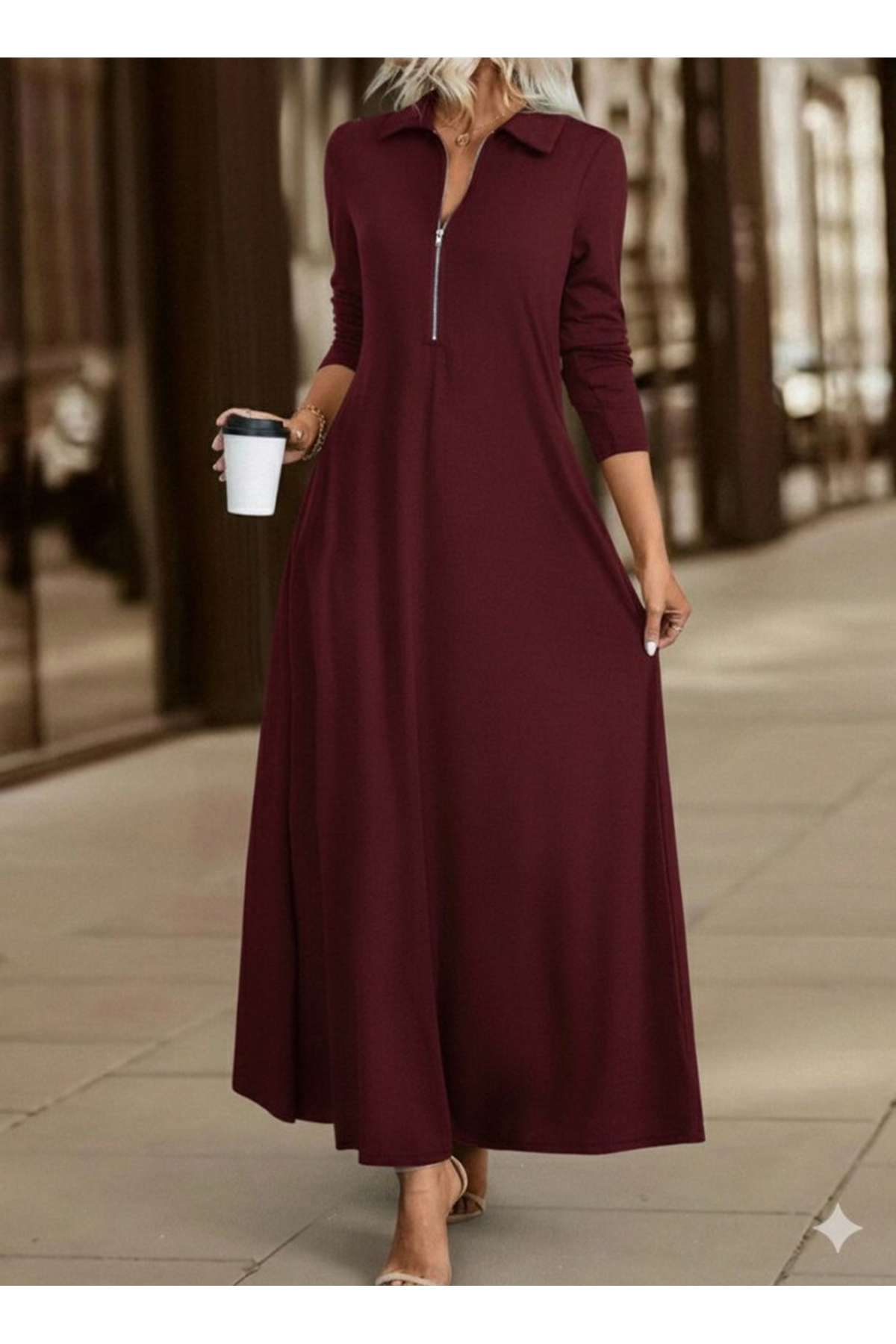 Kadın Uzun Kollu Yakalı önden Fermuarlı Uzun Viskon Iki Iplik Elbise