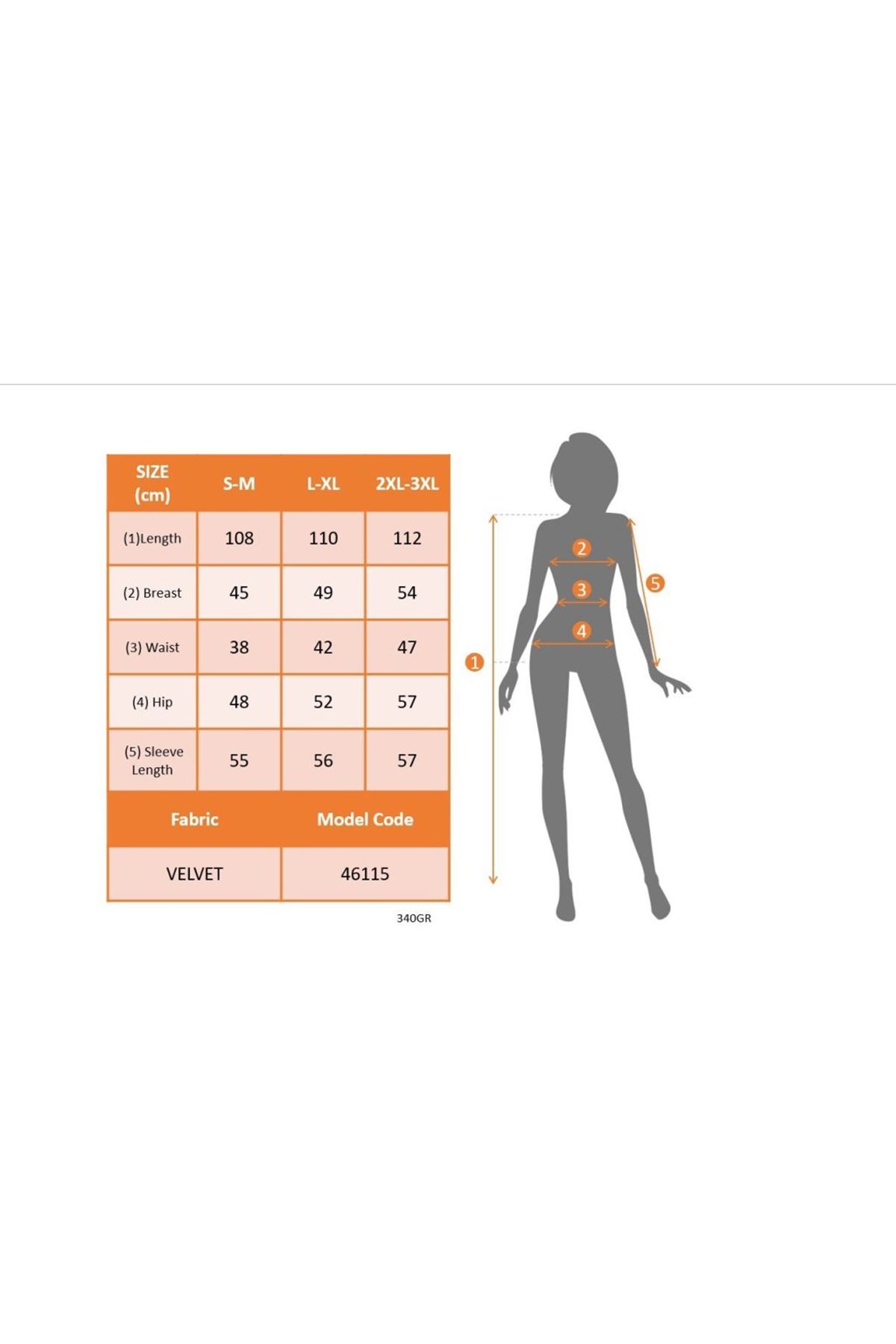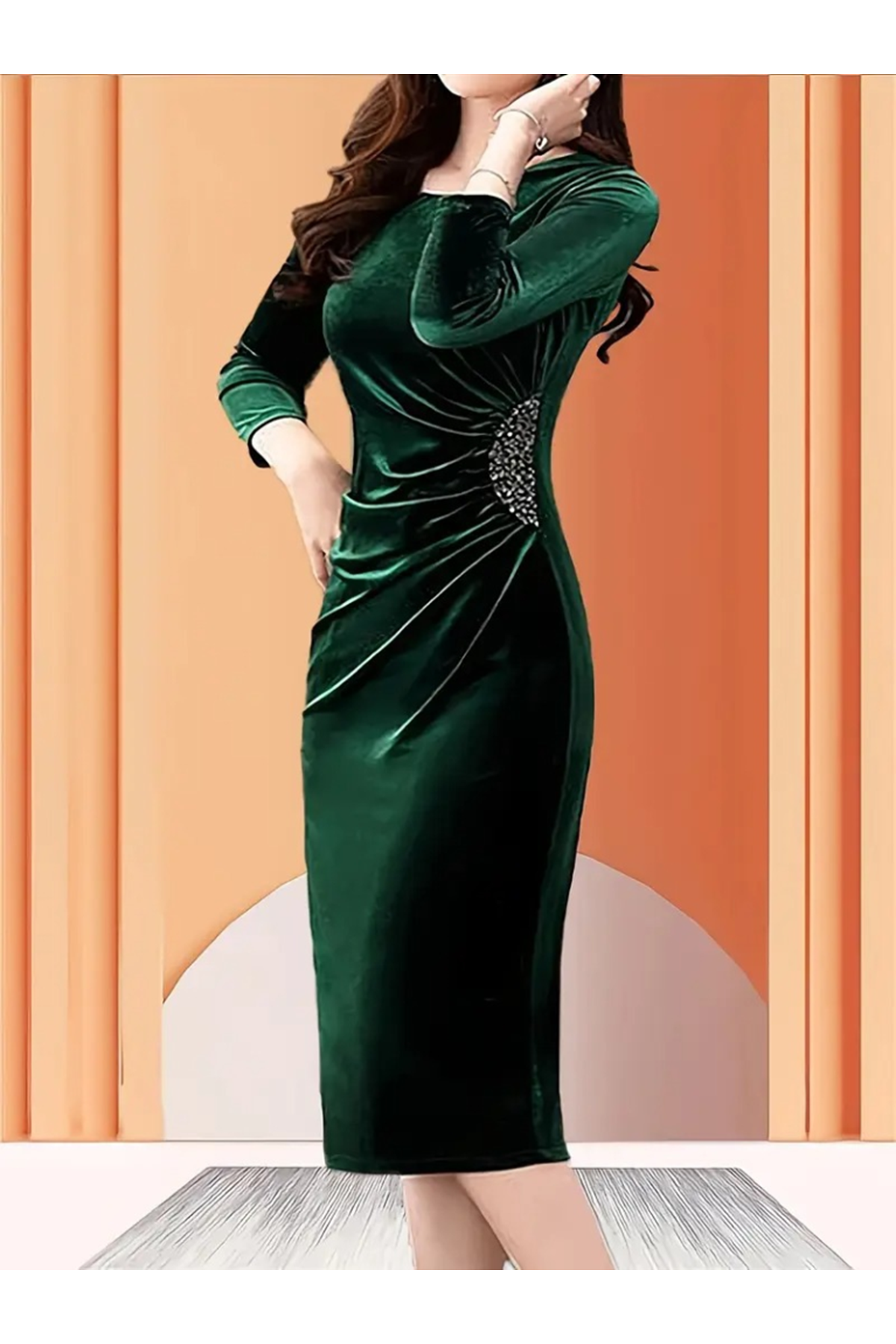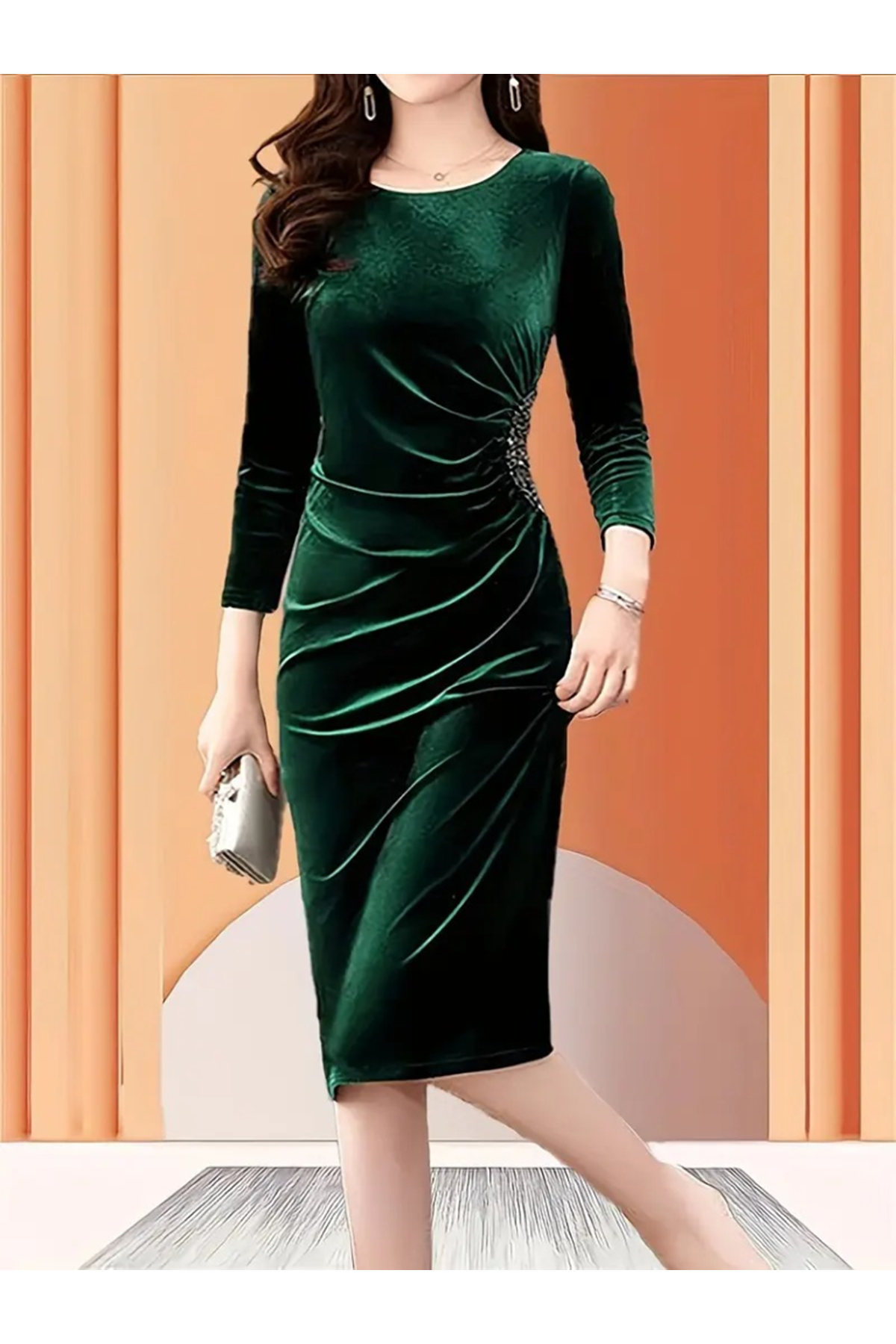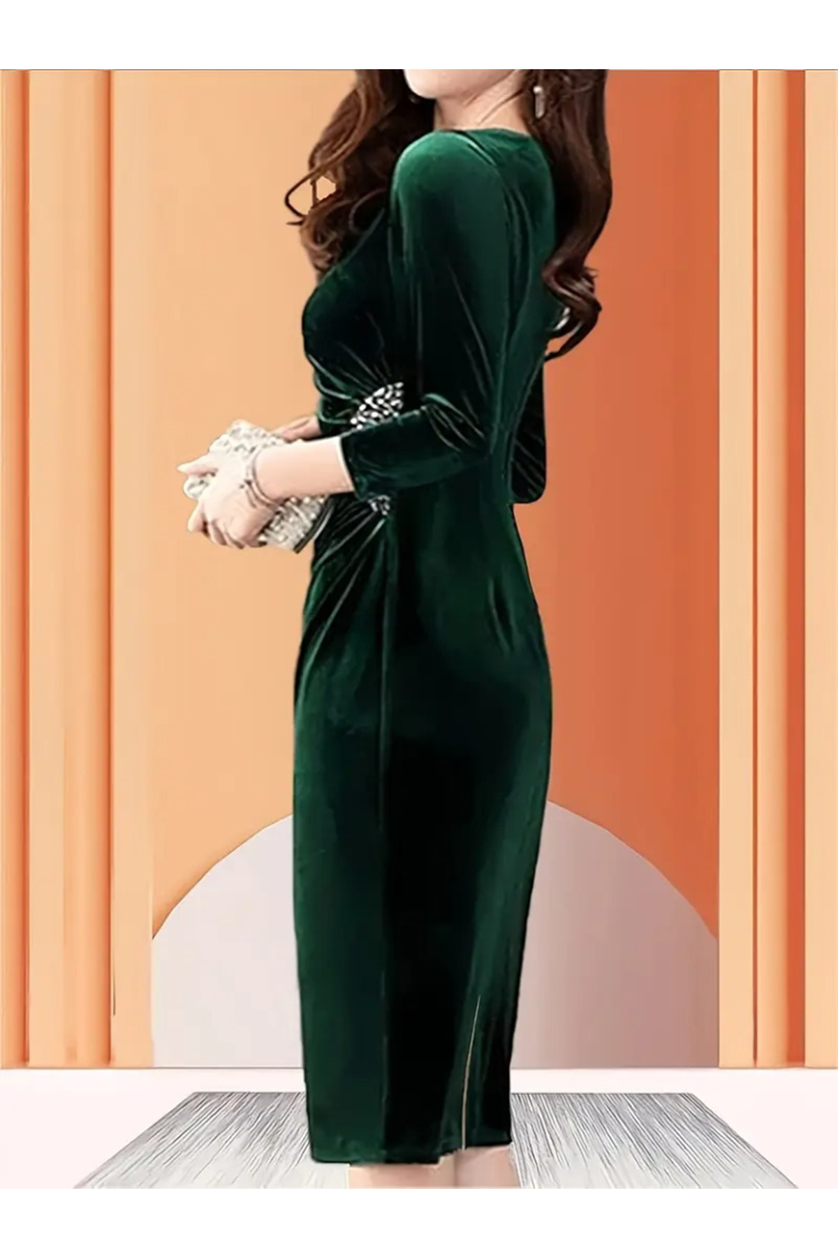 Kadın Uzun Kollu Yakası Açık Yanlardan Büzgülü Taş Detaylı Midi Kadife Elbise