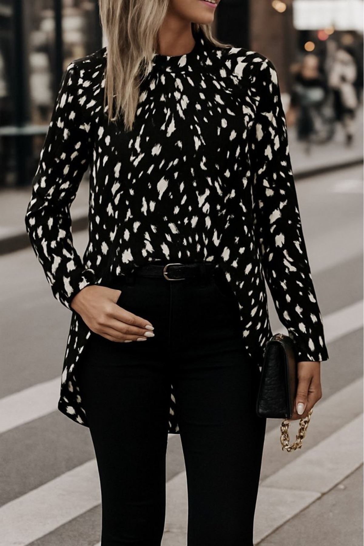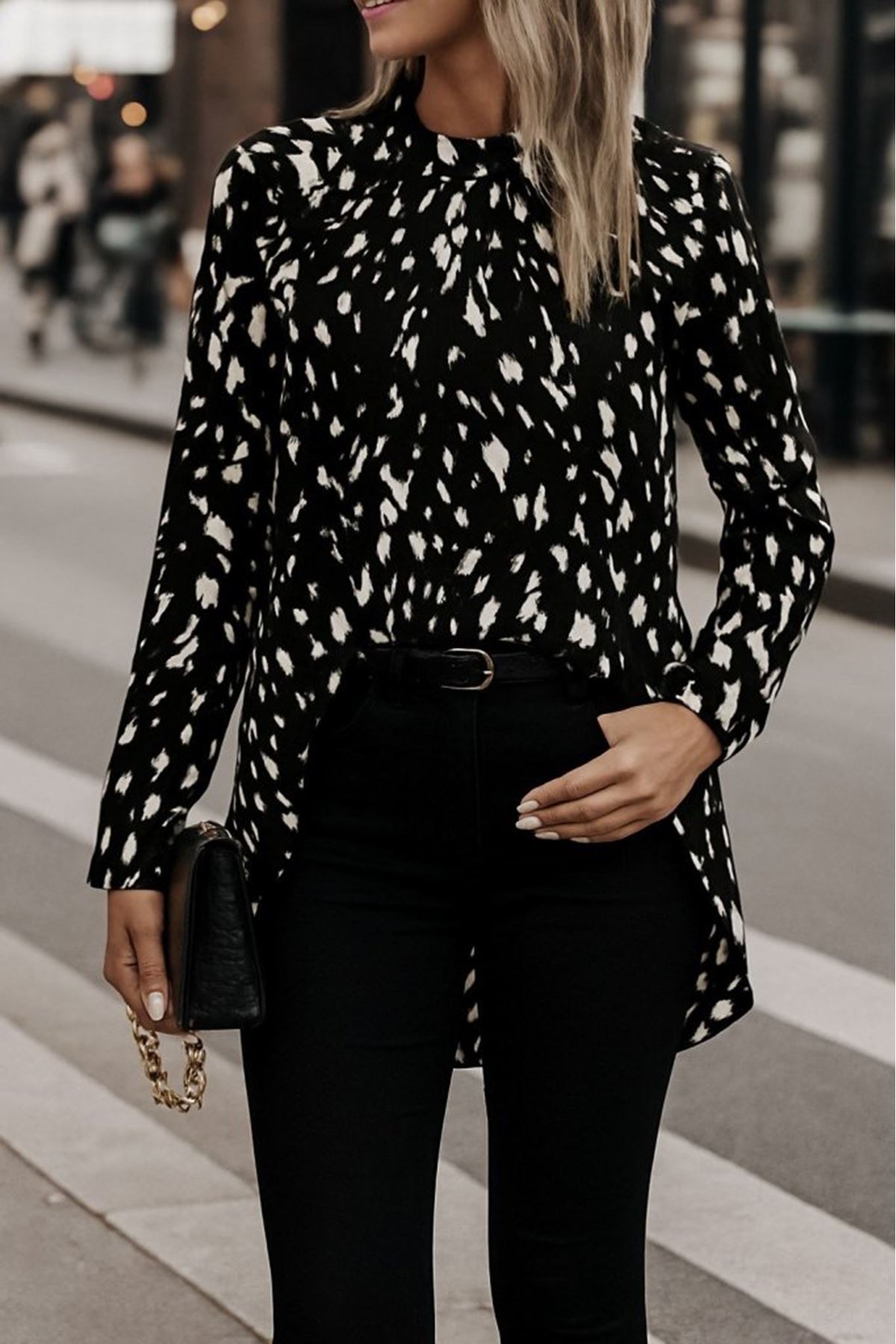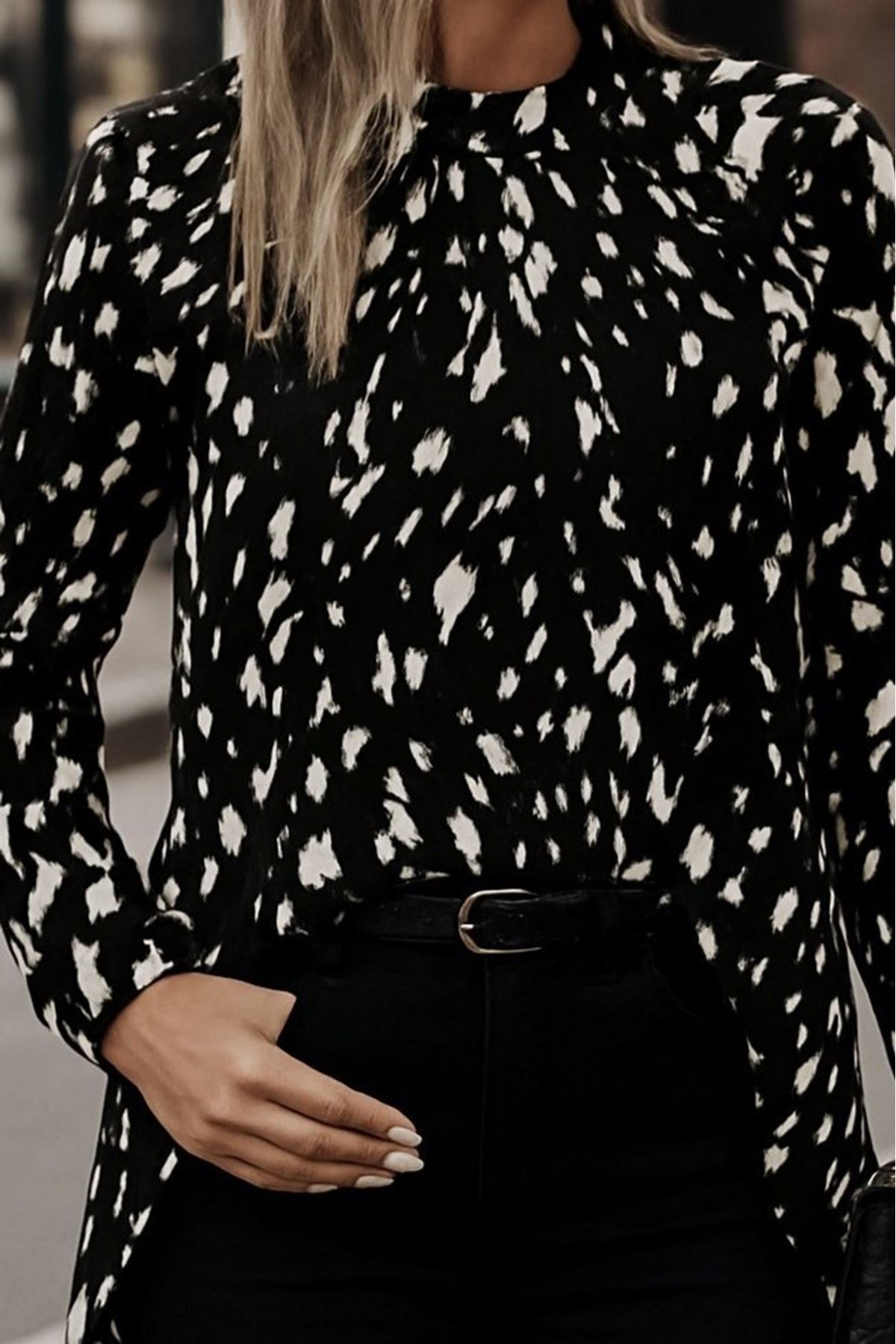 Kadın Uzun Kollu Yarı Balıkçı Yaka Desenli Dokuma Bluz