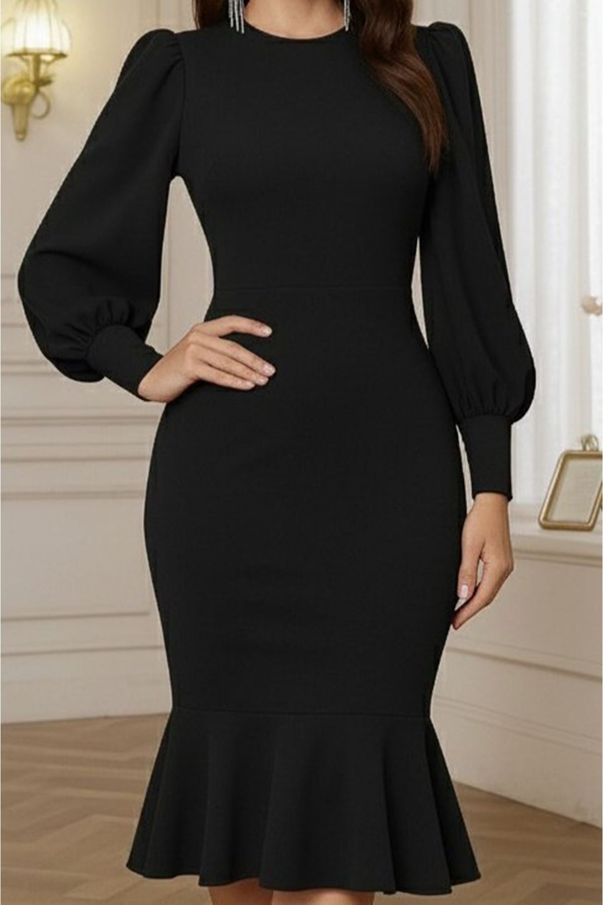 Kadın Uzun Kollu Yarı Balıkçı Yaka Etek Ucu Fırfır Detaylı Midi Ithal Krep Elbise