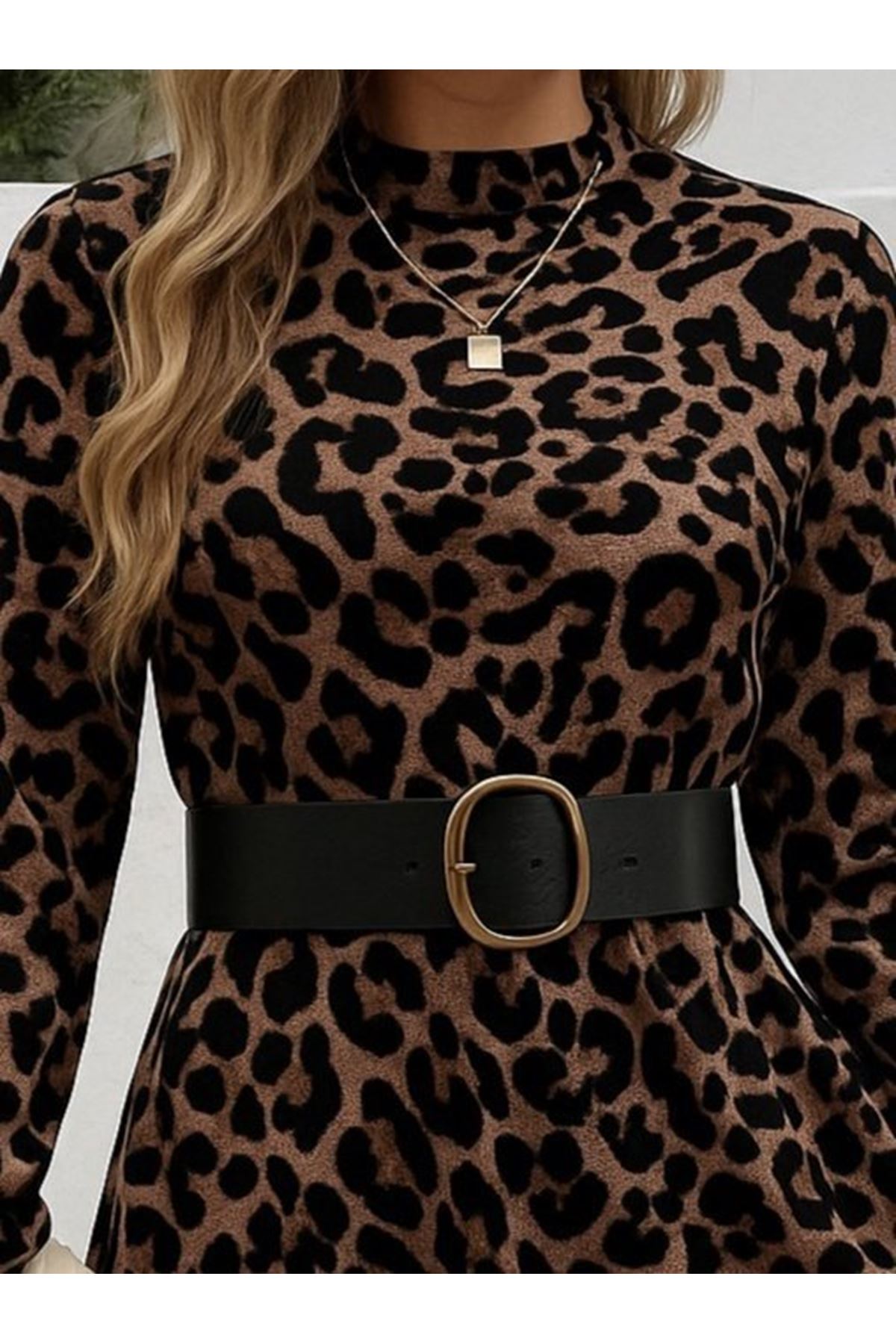 Kadın Uzun Kollu Yarı Balıkçı Yaka Leopar Desenli Kadife Elbise