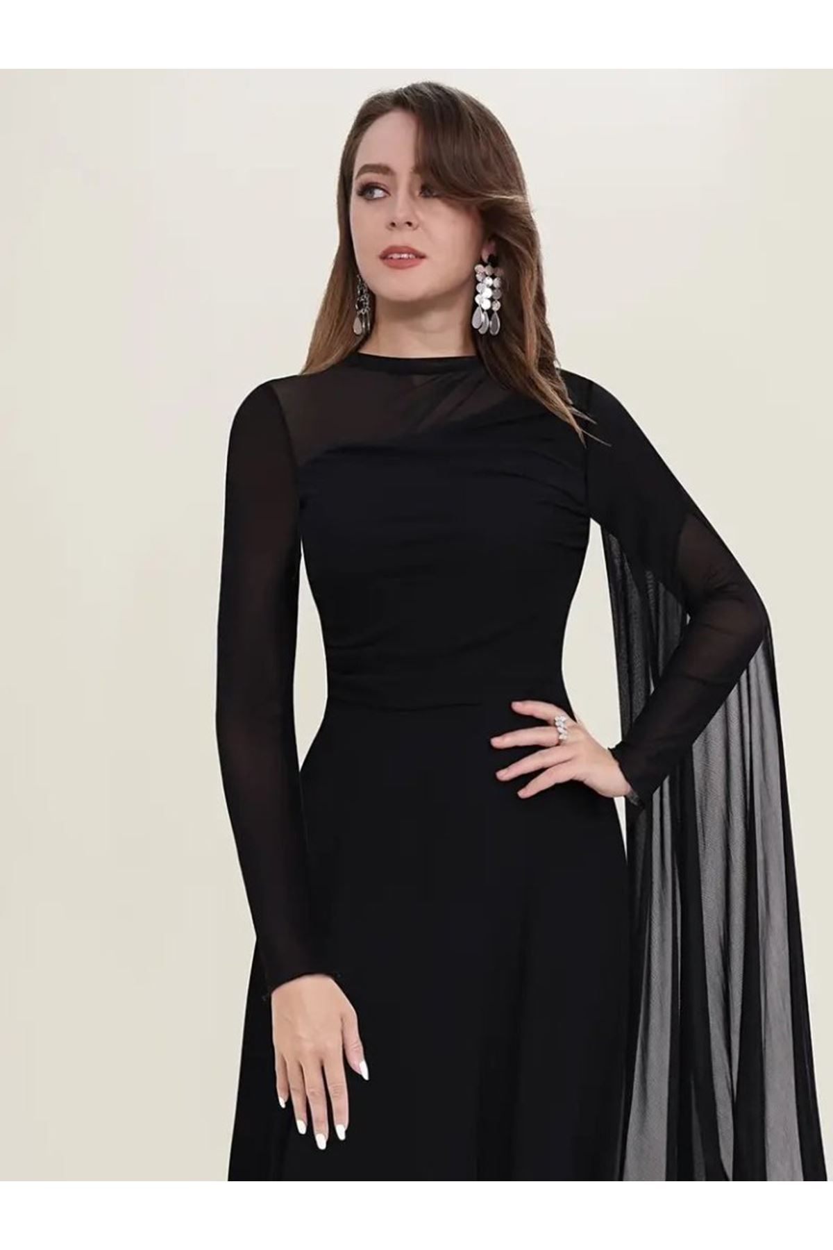 Kadın Uzun Kollu Yarı Balıkçı Yaka Tül Detaylı Uzun Sandy Elbise