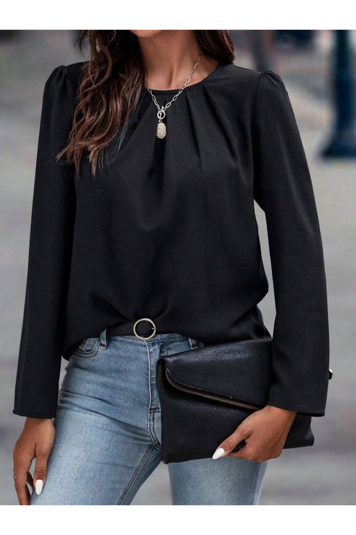 Kadın Uzun Kollu Yuvarlak önden Pileli Ithal Krep Bluz