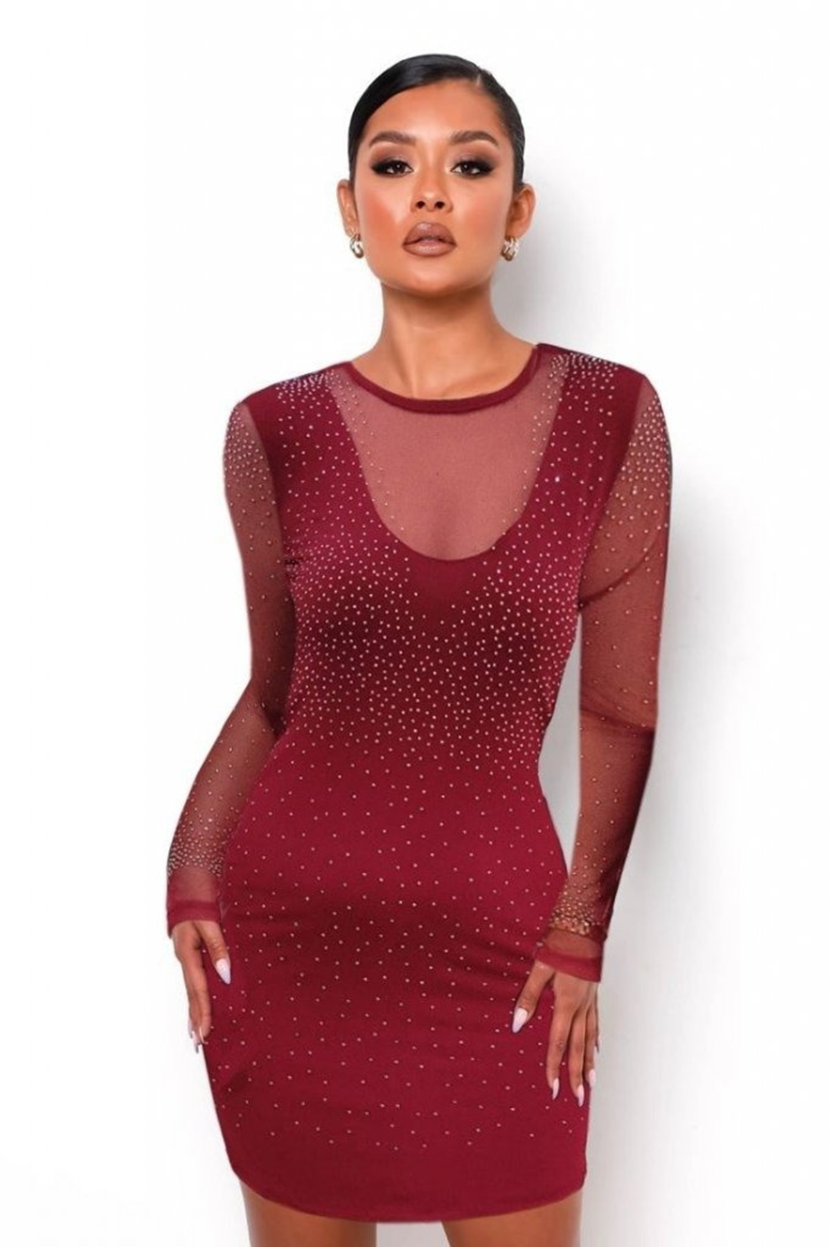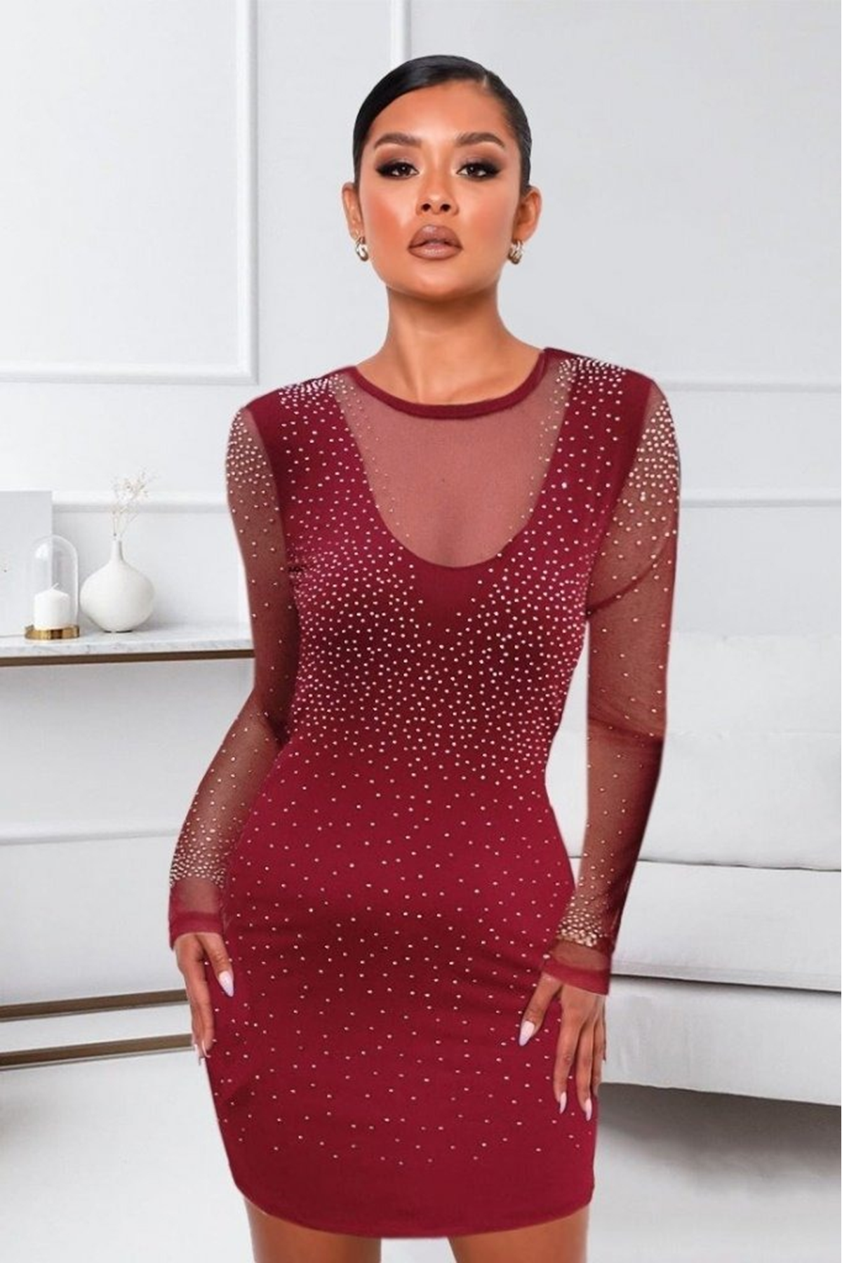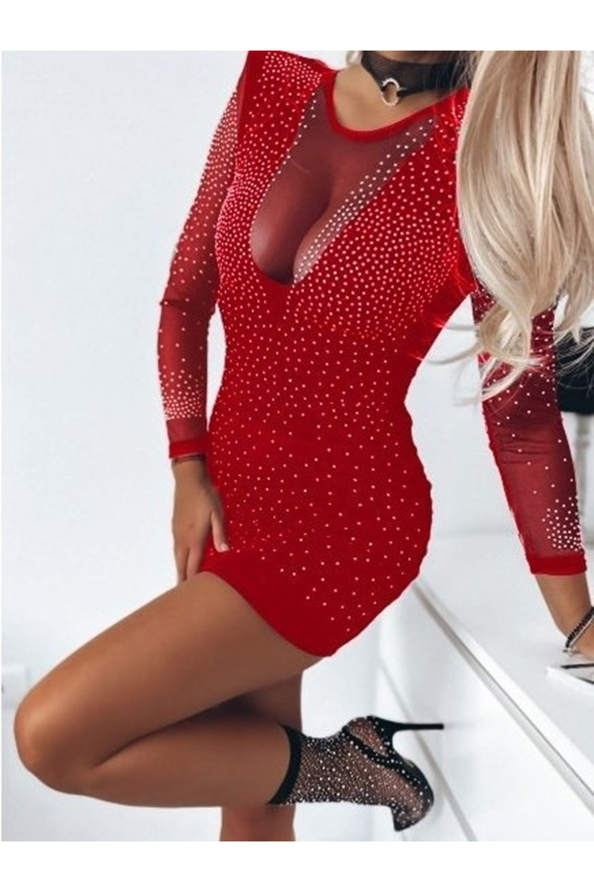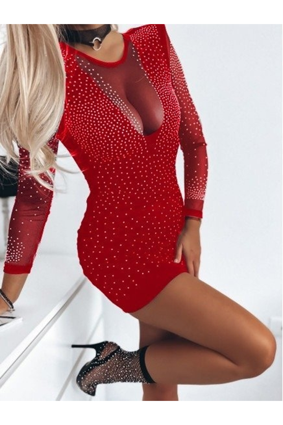Kadın Uzun Kollu Yuvarlak Yaka Dekolteli Taşlı Dalgıç Elbise