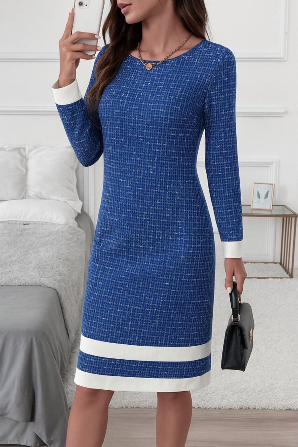 Kadın Uzun Kollu Yuvarlak Yaka Etek Ucu şerit Detaylı Mini Dokuma Elbise