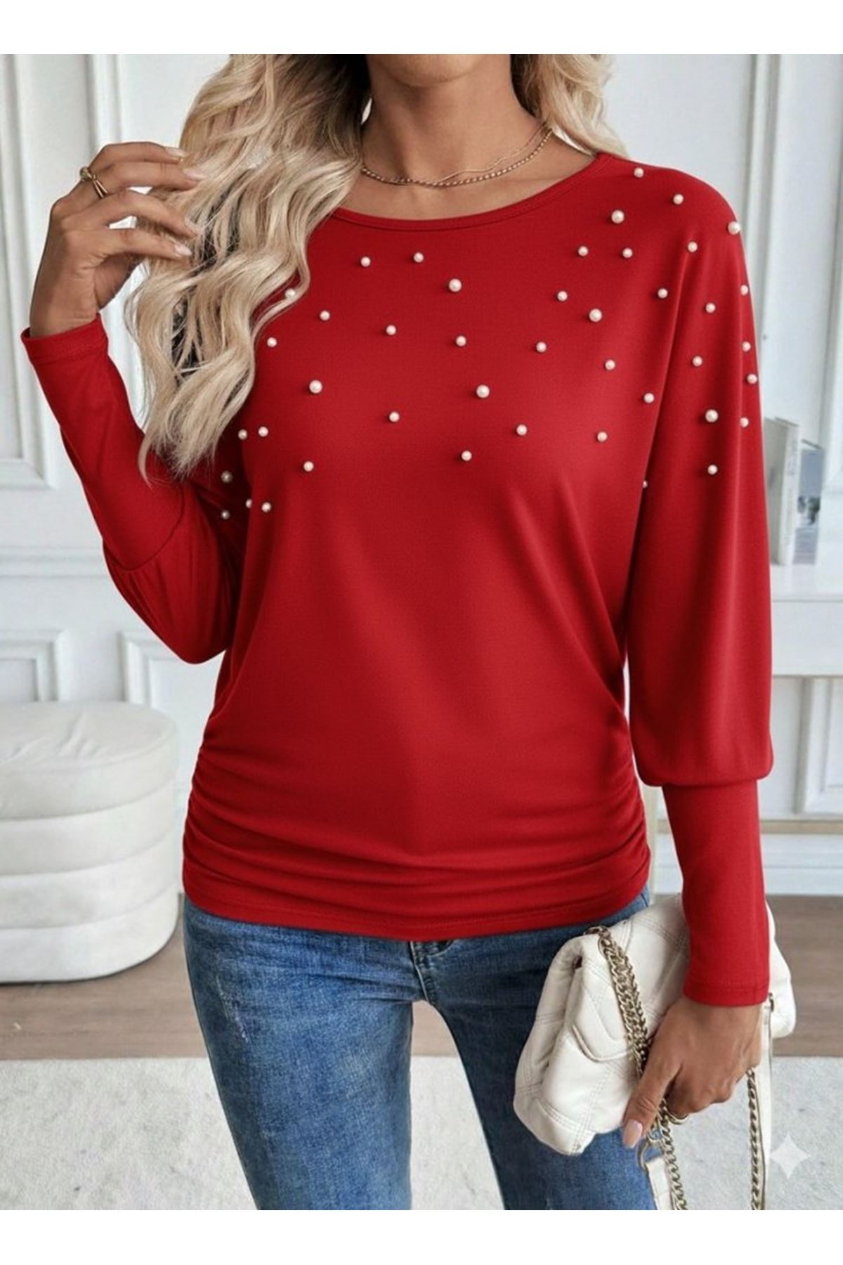 Kadın Uzun Kollu Yuvarlak Yaka Incili Viskon Bluz