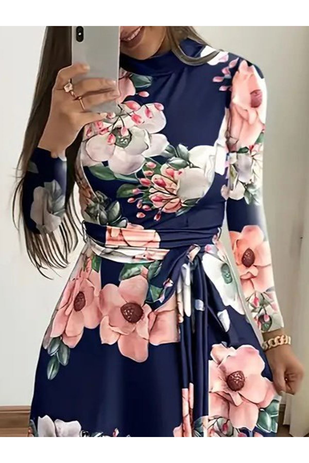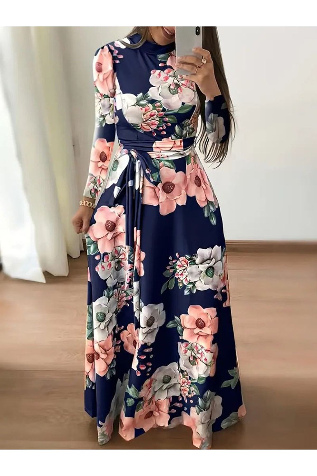 Kadın Uzun Kollu Yuvarlak Yakalı Beli Kuşaklı Desenli Süprem Uzun Elbise