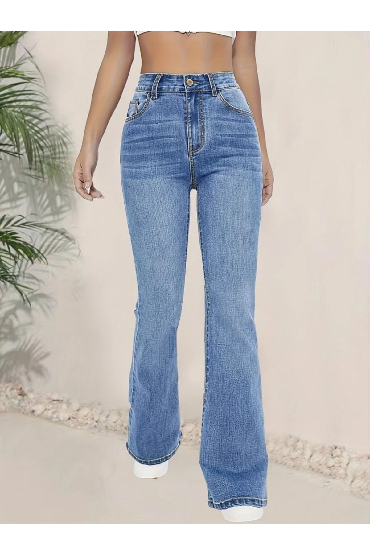 Kadın Yüksek Bel İspanyol Paça Kot Pantolon