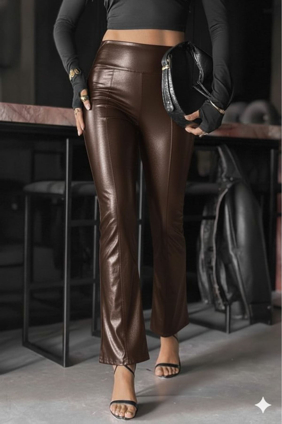 Kadın Yüksek Bel Paçaya Doğru Geniş Deri Pantolon