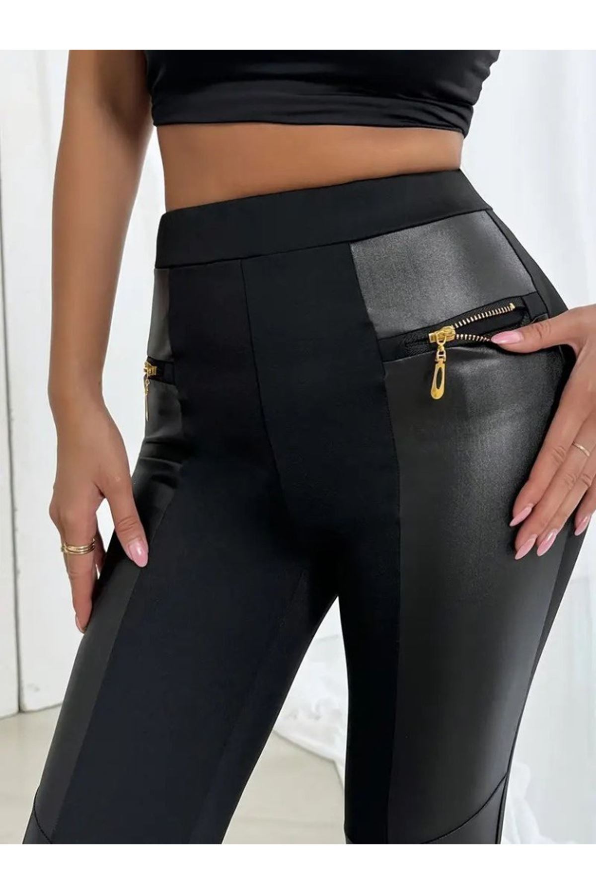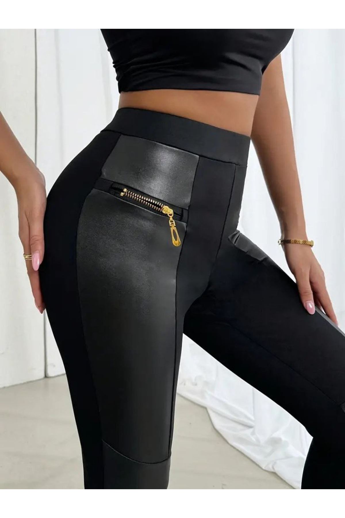 Kadın Yüksek Bel Yan şerit Deri Detay Fermuarlı Dalgıç Tayt