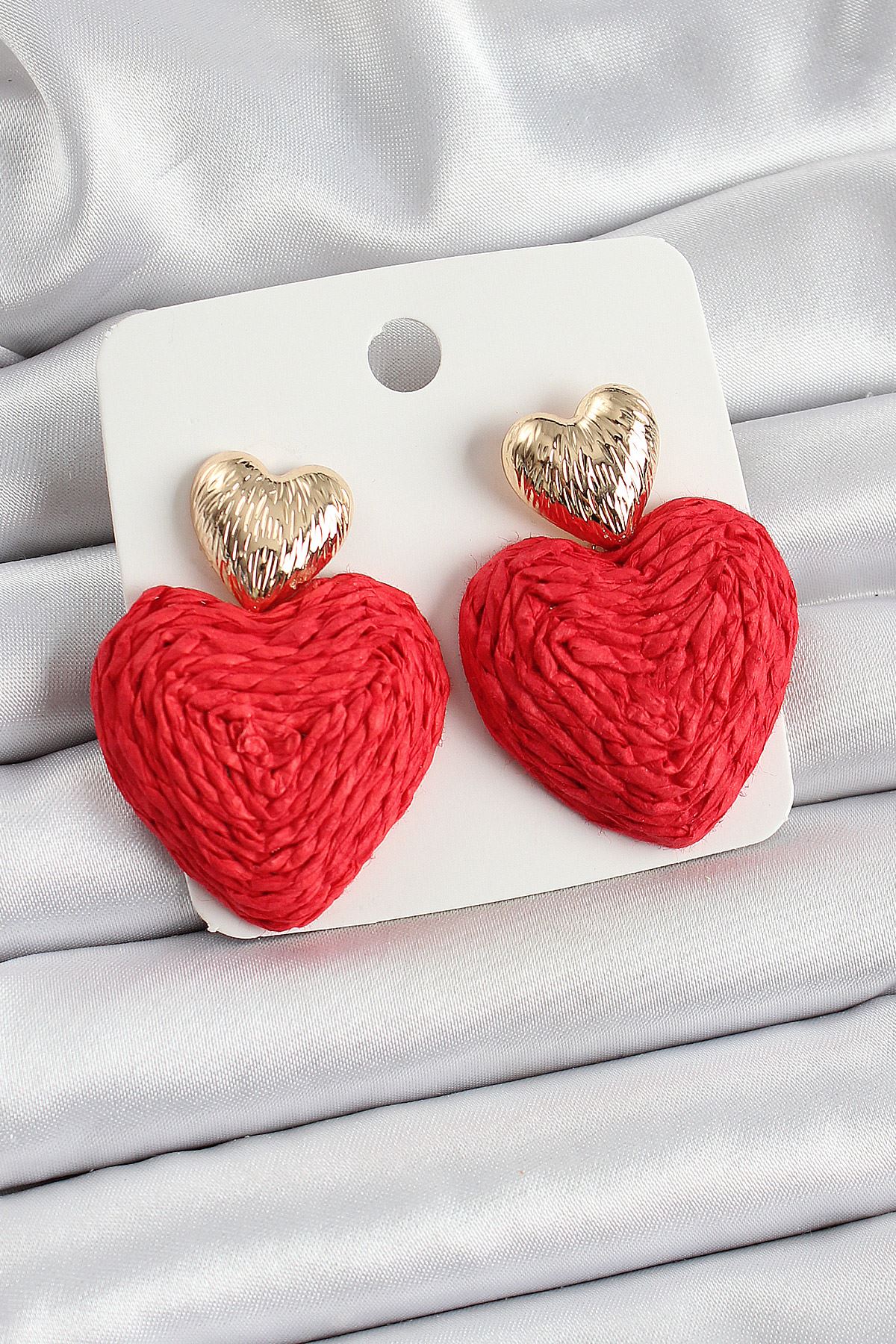 Kırmızı Kalp Figürlü Hasır Örgü Model Gold Renk Kadın Küpe - TJ-BKP10735