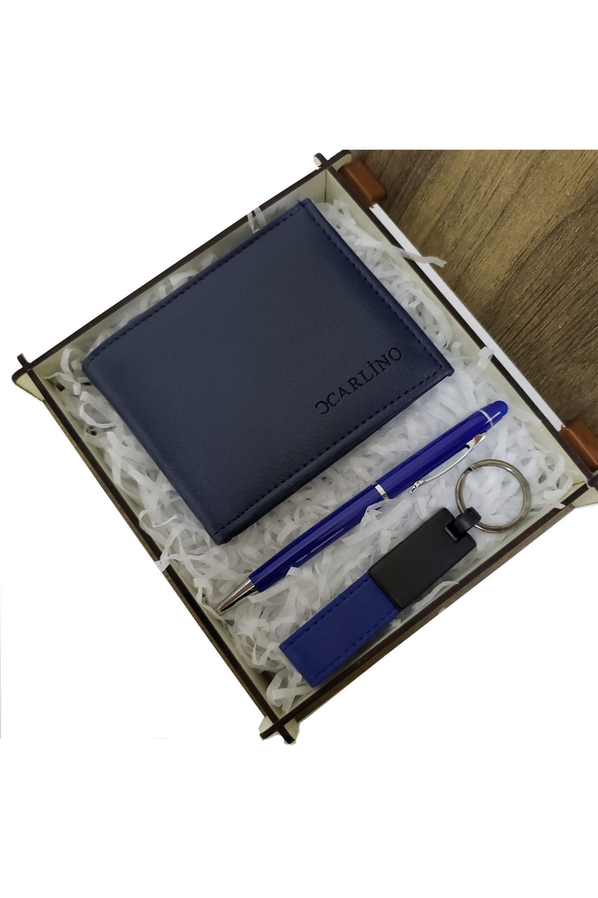 Mavi Cüzdan Kalem Ve Deri Mavi Anahtarlık Set