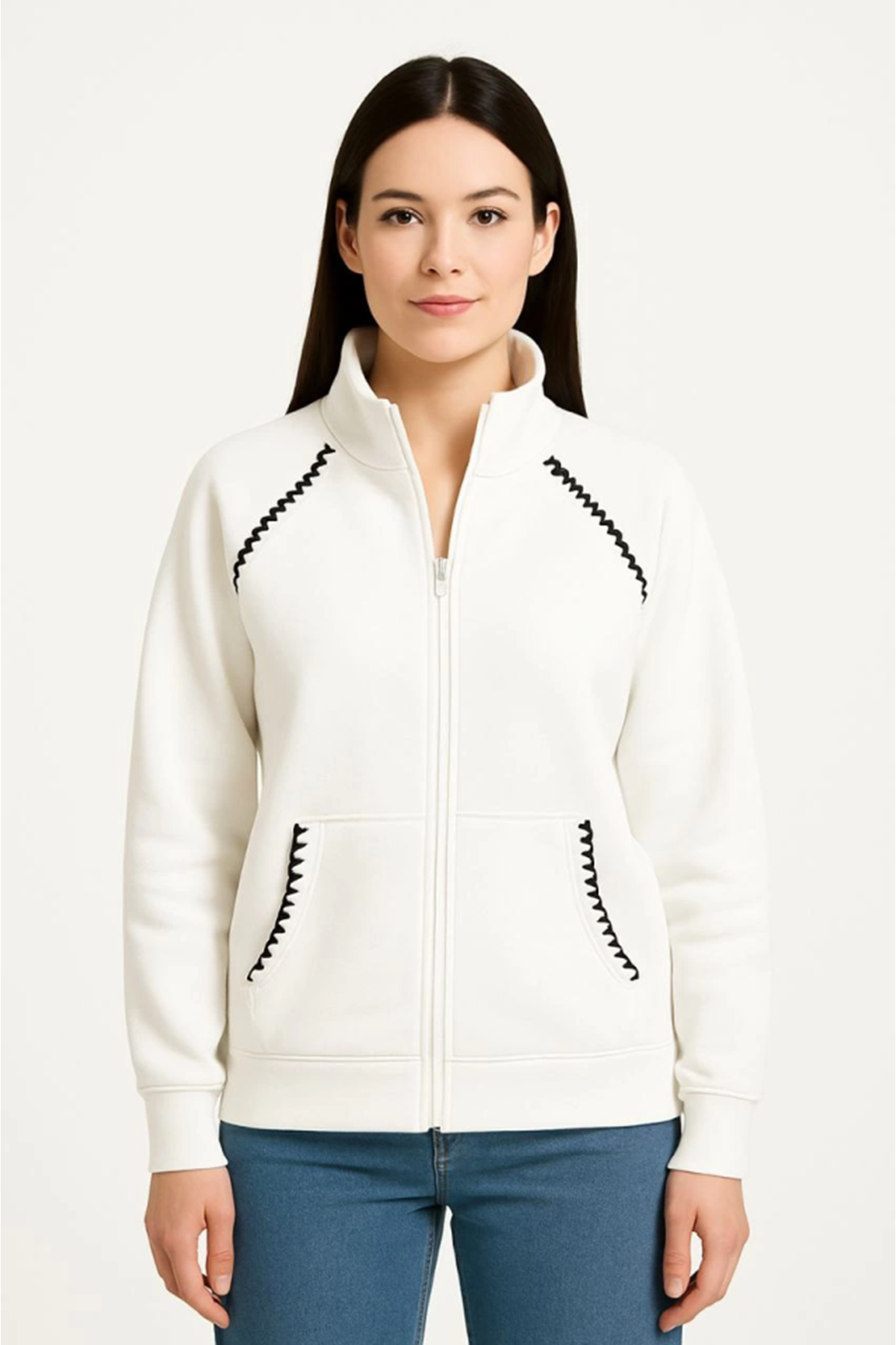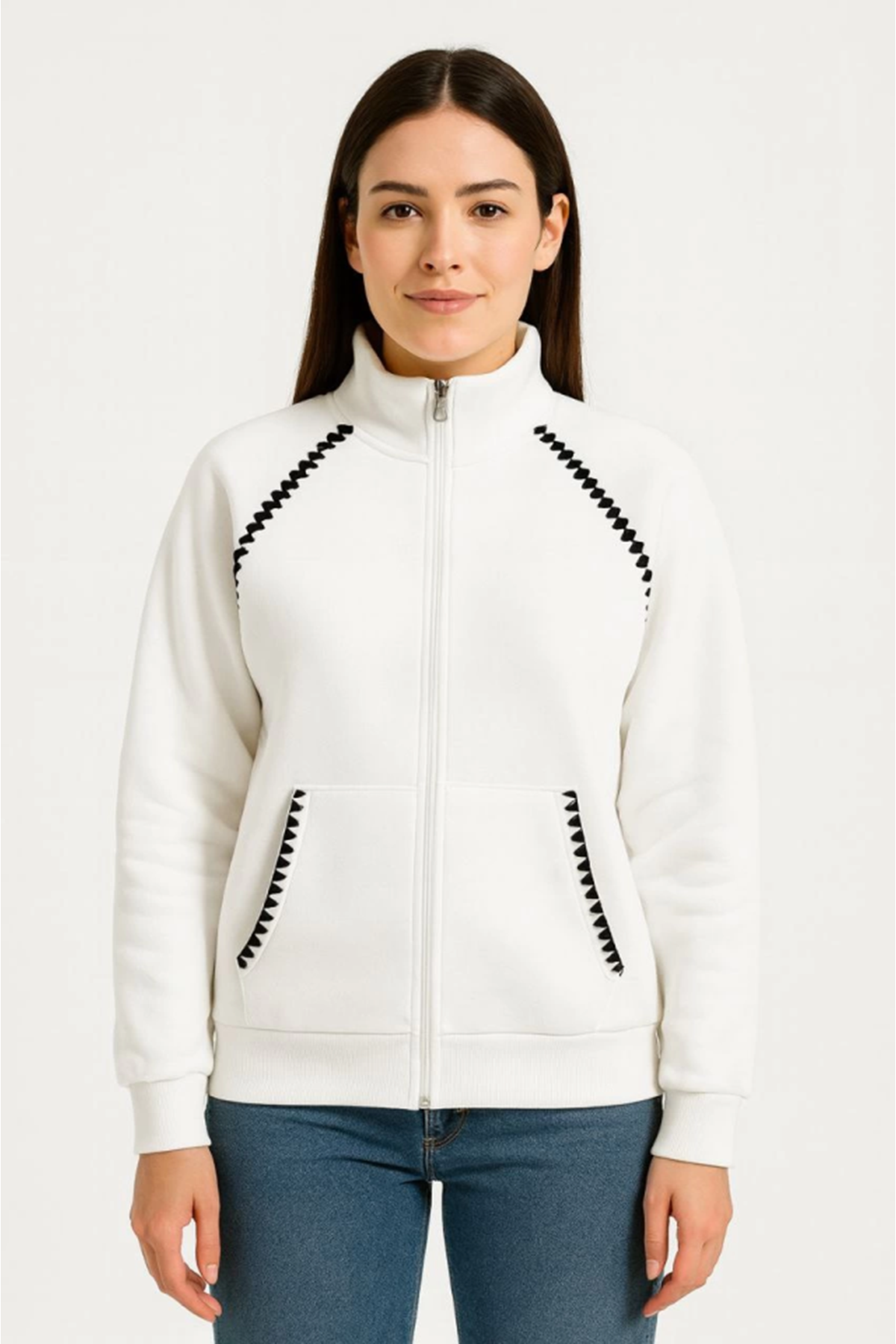 Oversize Dik Yaka Fermuarlı Sweatshirt - Zincir Nakışli Kanguru Cepli, - Beyaz
