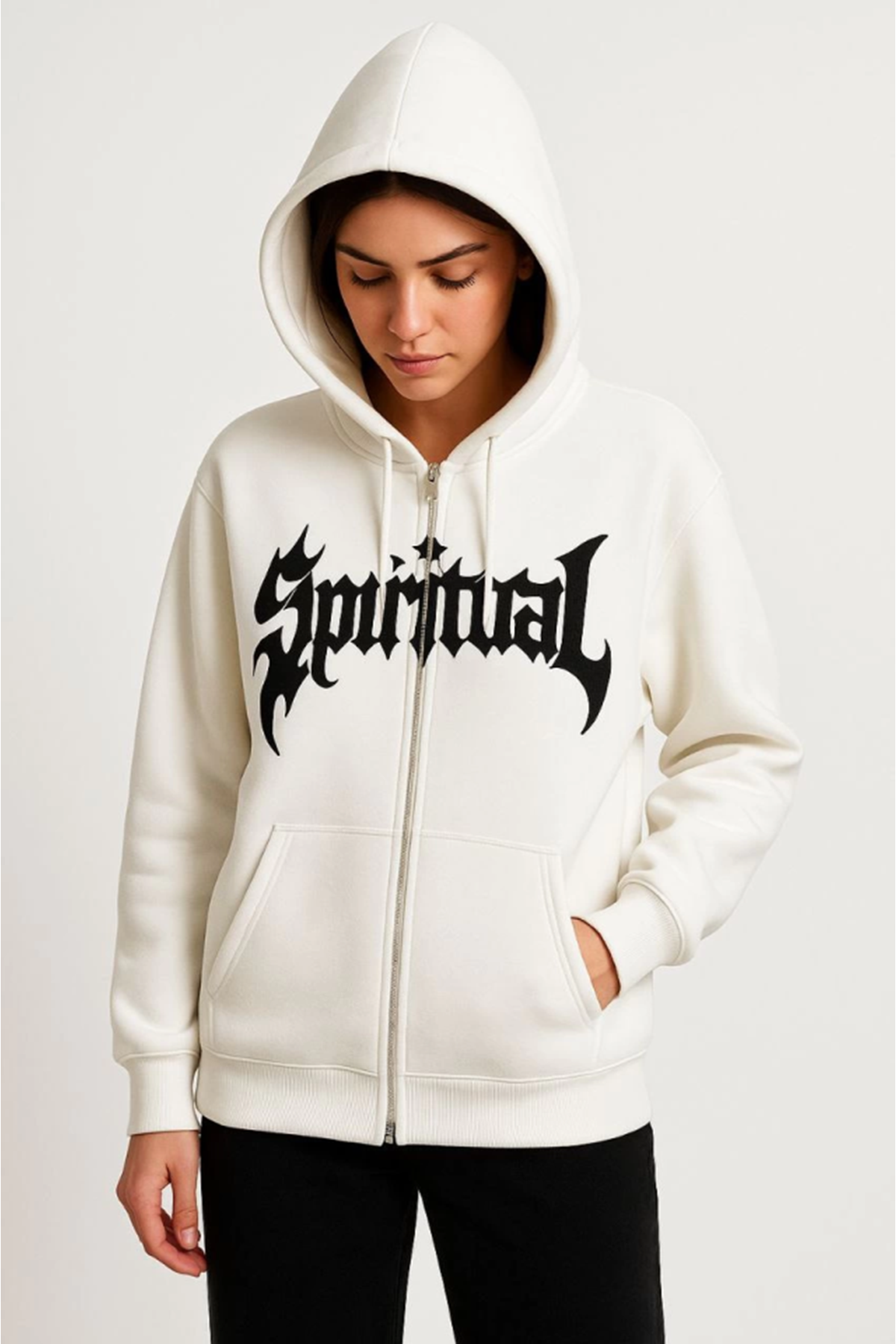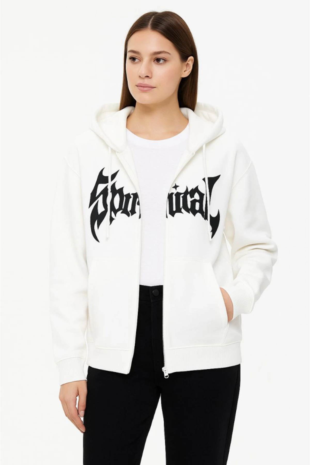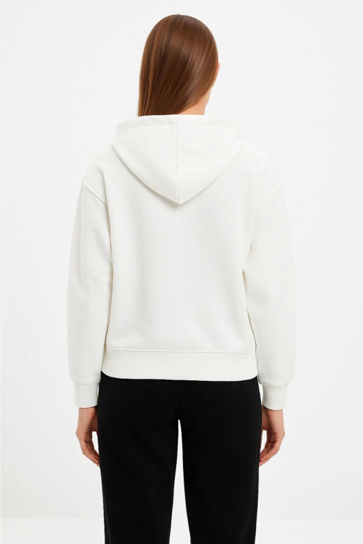Oversize Kapüşonlu Sweatshirt Hoodie 3 İplik Şardonlu Pamuklu Kumaş, Önü Baskılı, Fermuarlı Rahat Kalıp, Kışlık Ve Sokak Stili Sweat - Beyaz