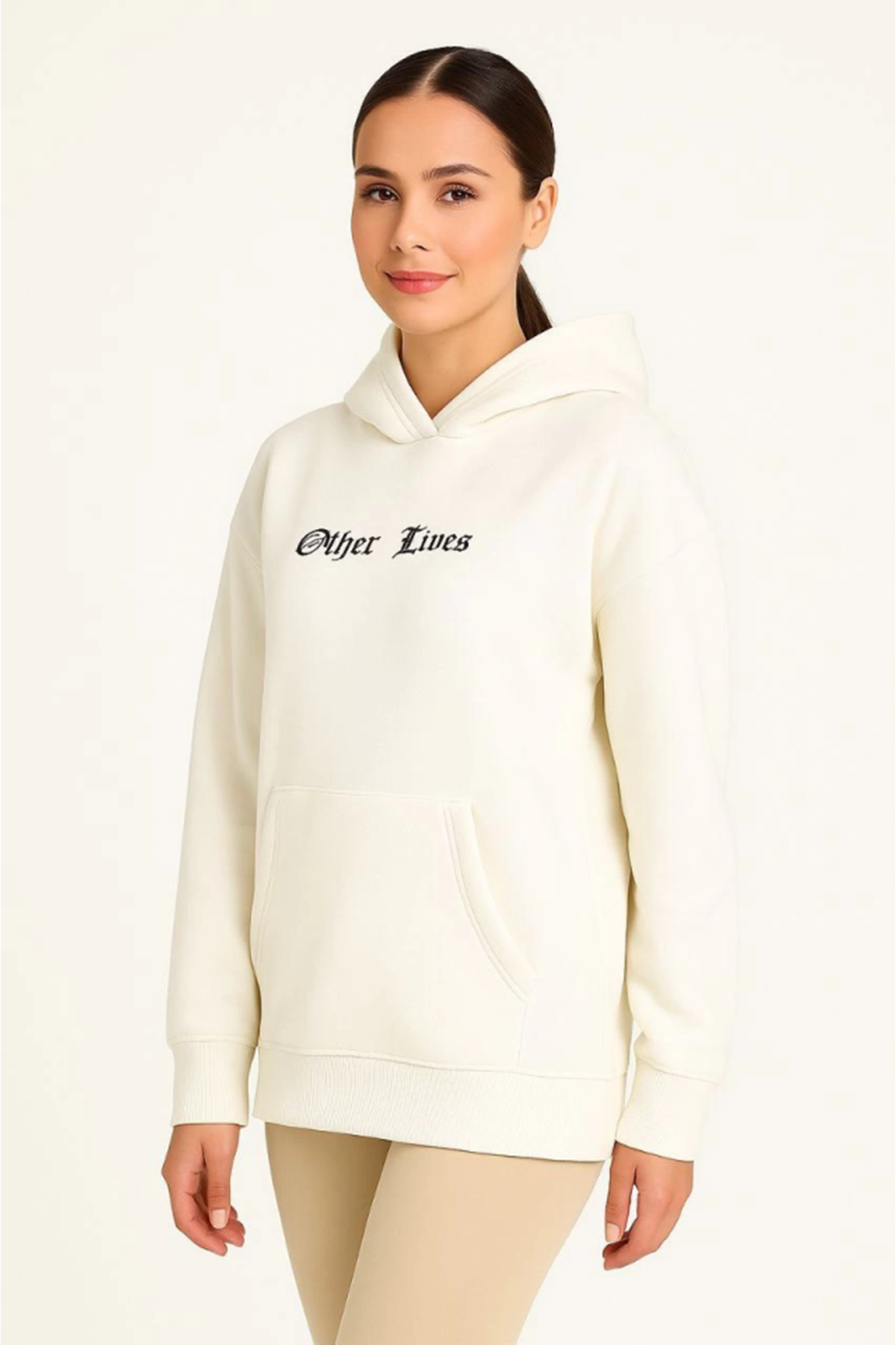 Oversize Üç İplik Şardonlu Kapüşonlu Sweatshirt – Beyaz “Other Lives” Ön Ve Arka Baskılı, Kanguru Cepli, Ribanalı Rahat Kışlık Model Beyaz