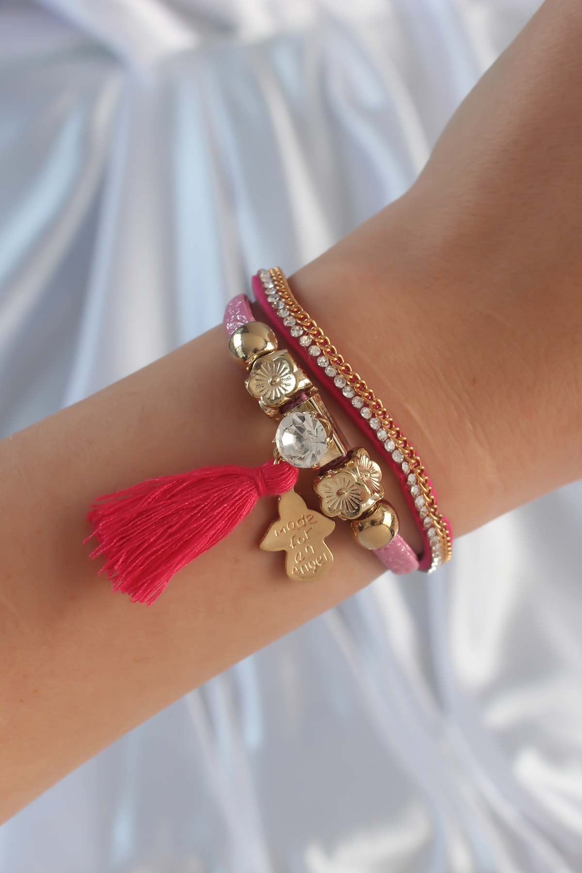 Pembe Renk Zirkon Taşlı Püskül Detay Deri Çoklu Bileklik - TJ-BB6343