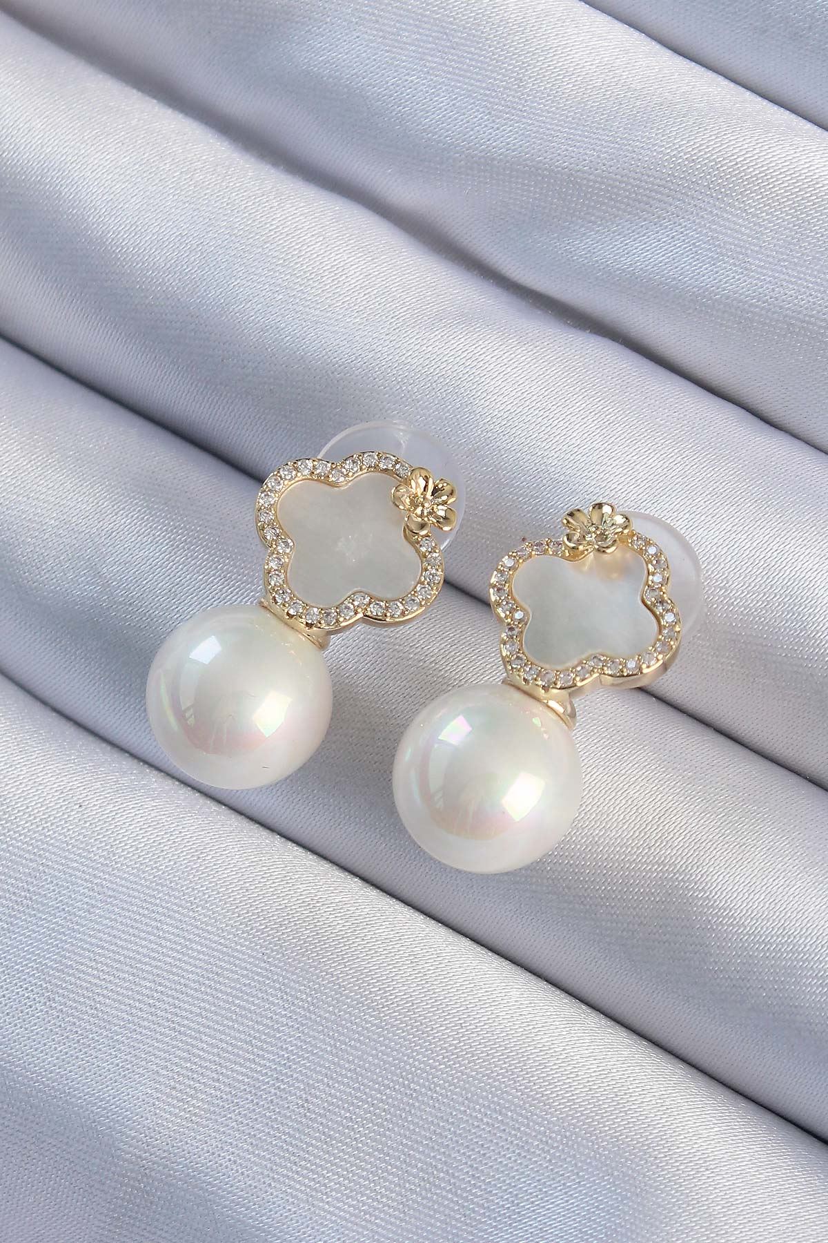 Pirinç Altın Renk Zirkon Taşlı Minimal Çiçek Tasarımlı Kadın Küpe - TJ-BKP9480