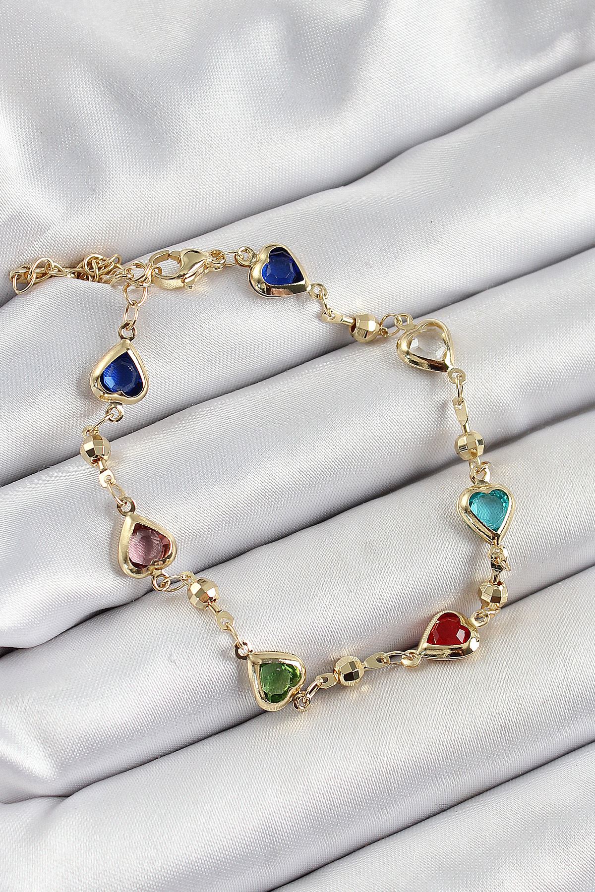 Pirinç Asorti Kalp Model Gold Renk Zirkon Taşlı Kadın Bileklik - TJ-BB7036