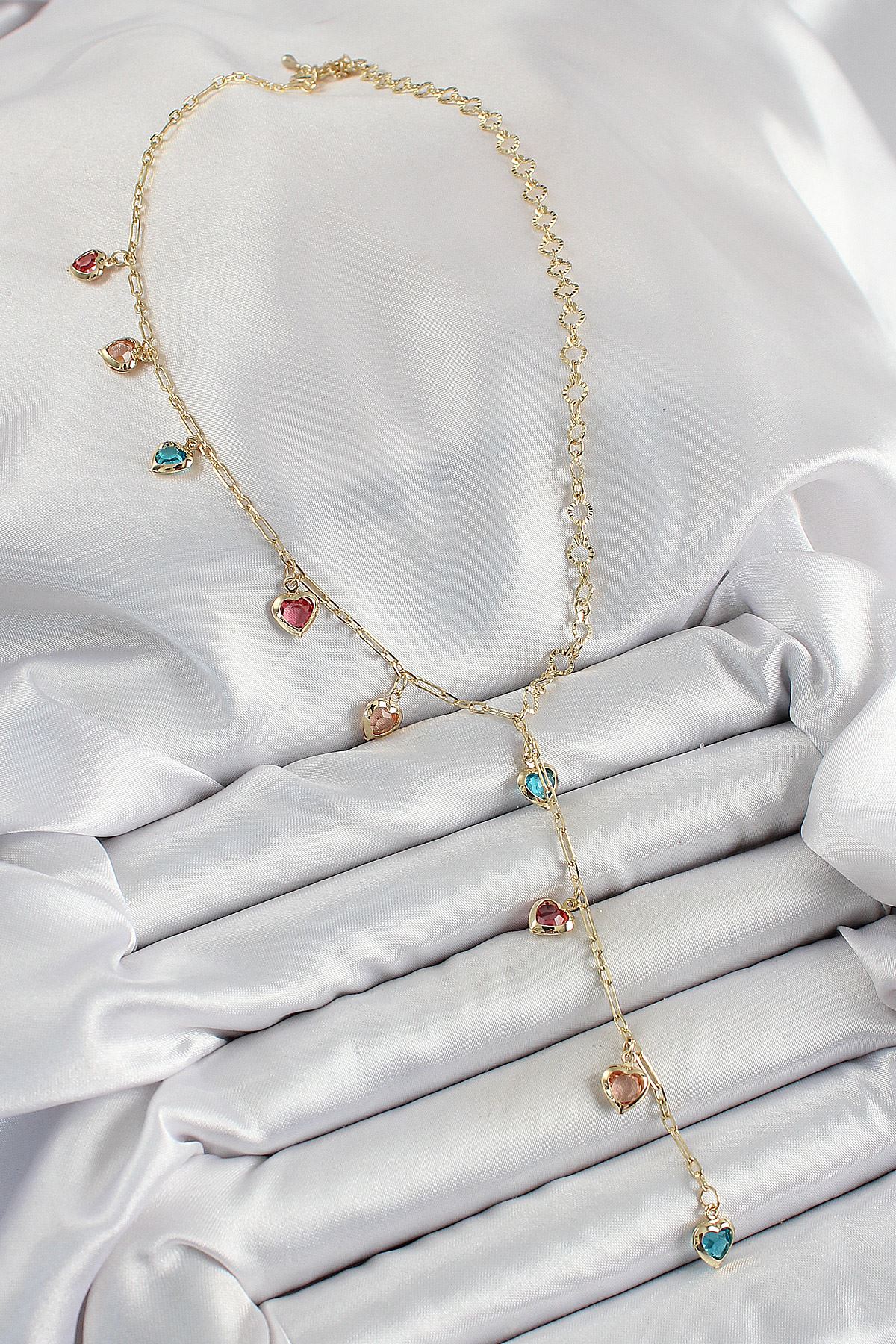Pirinç Asorti Kalp Model Gold Renk Zirkon Taşlı Y Kolye - TJ-BKO10248