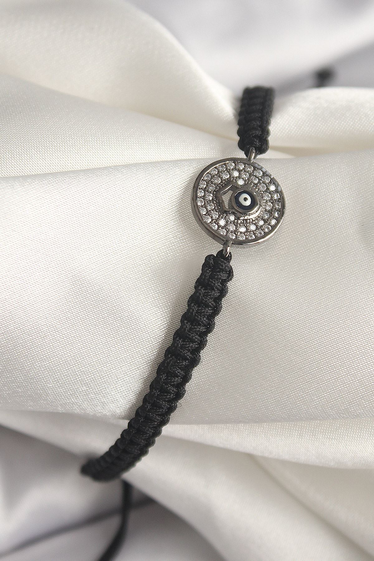 Pirinç Füme Renk Zirkon Taşlı Nazar Boncuk İşleme Makrome Asansörlü Model Kadın Bileklik - TJ-BB6788
