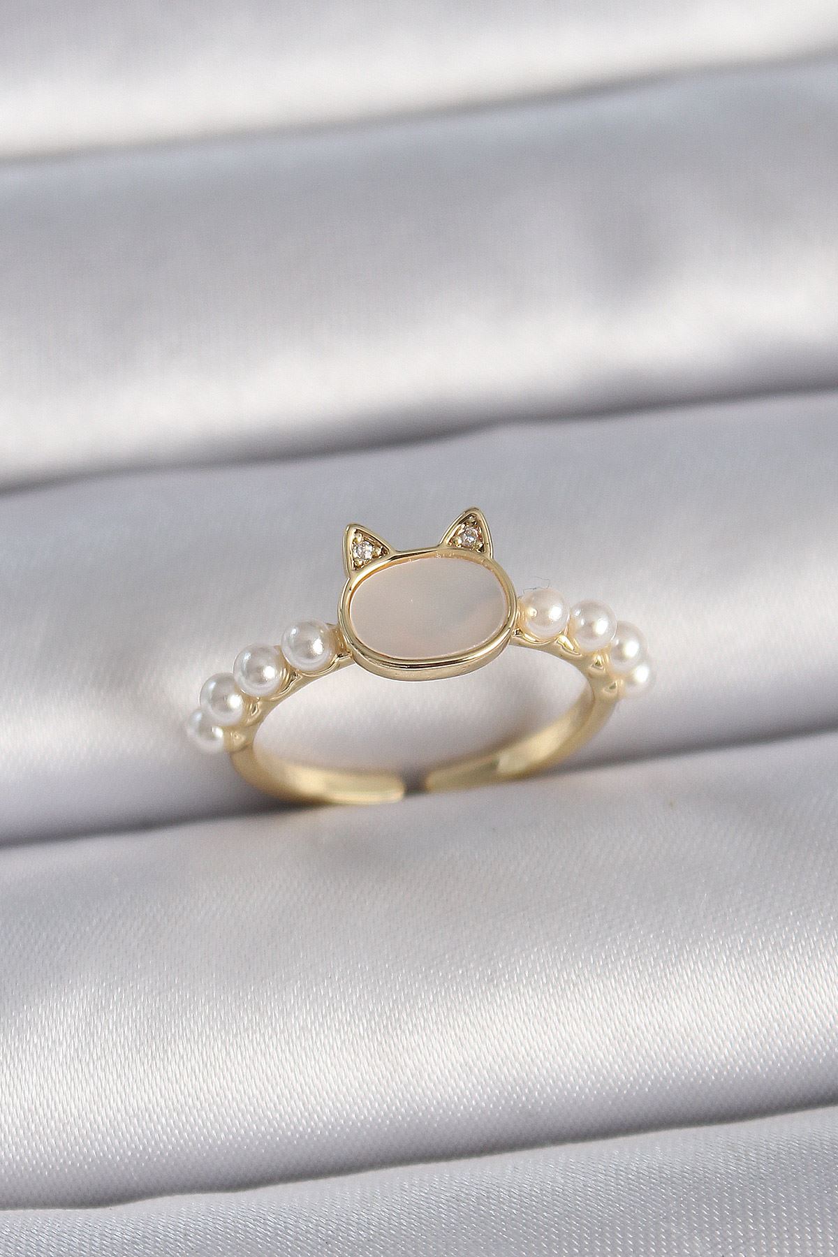Pirinç Gold Renk Ayarlanabilir Beyaz Mineli Kedi Model İnci Detay Kadın Yüzük - TJ-BYK3386