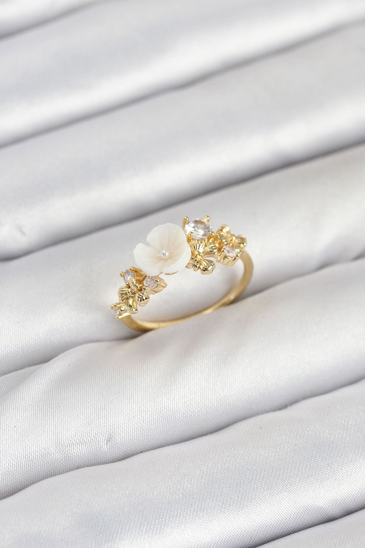 Pirinç Gold Renk Çiçek Model Zirkon Taşlı Kadın Yüzük - TJ-BYK3878