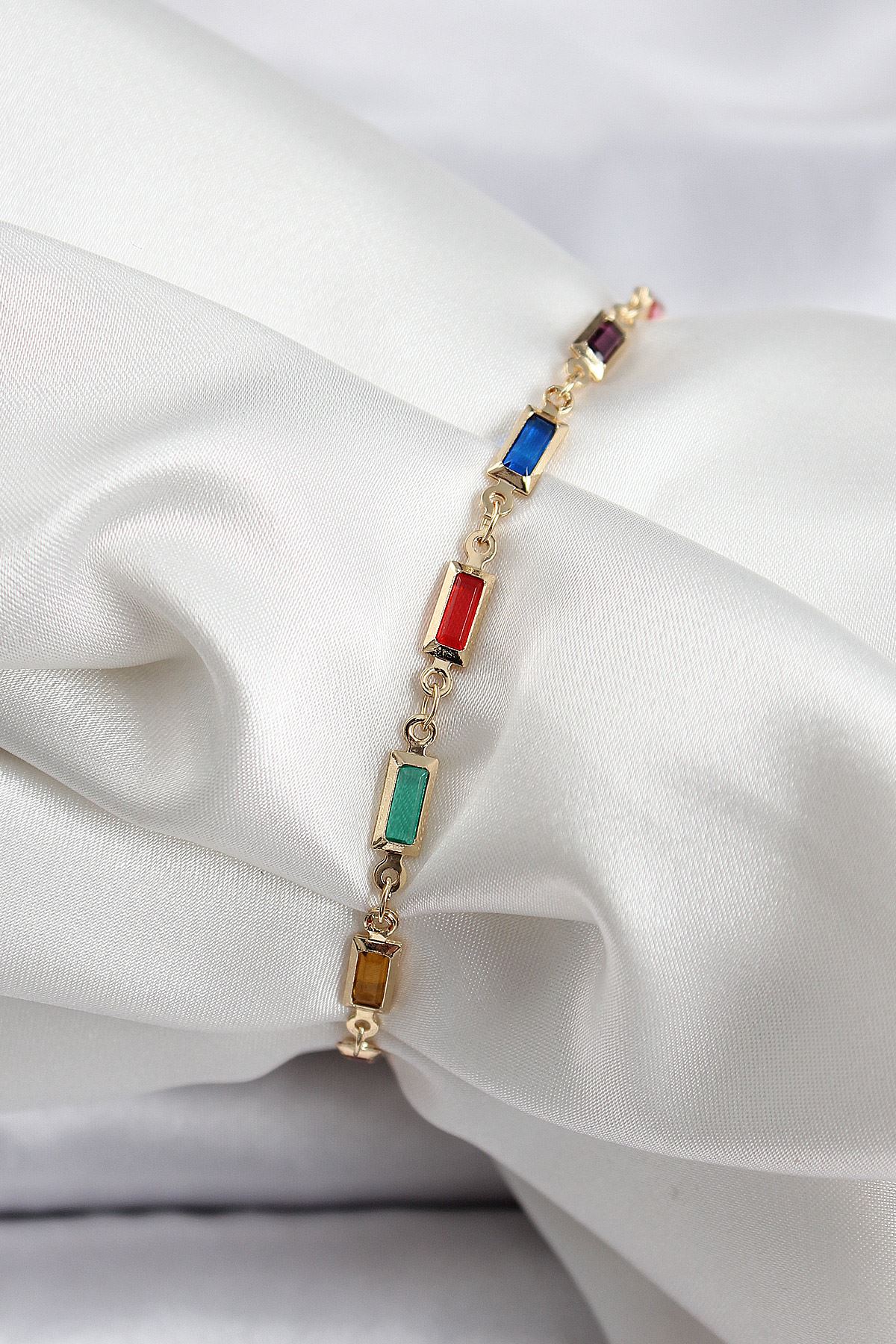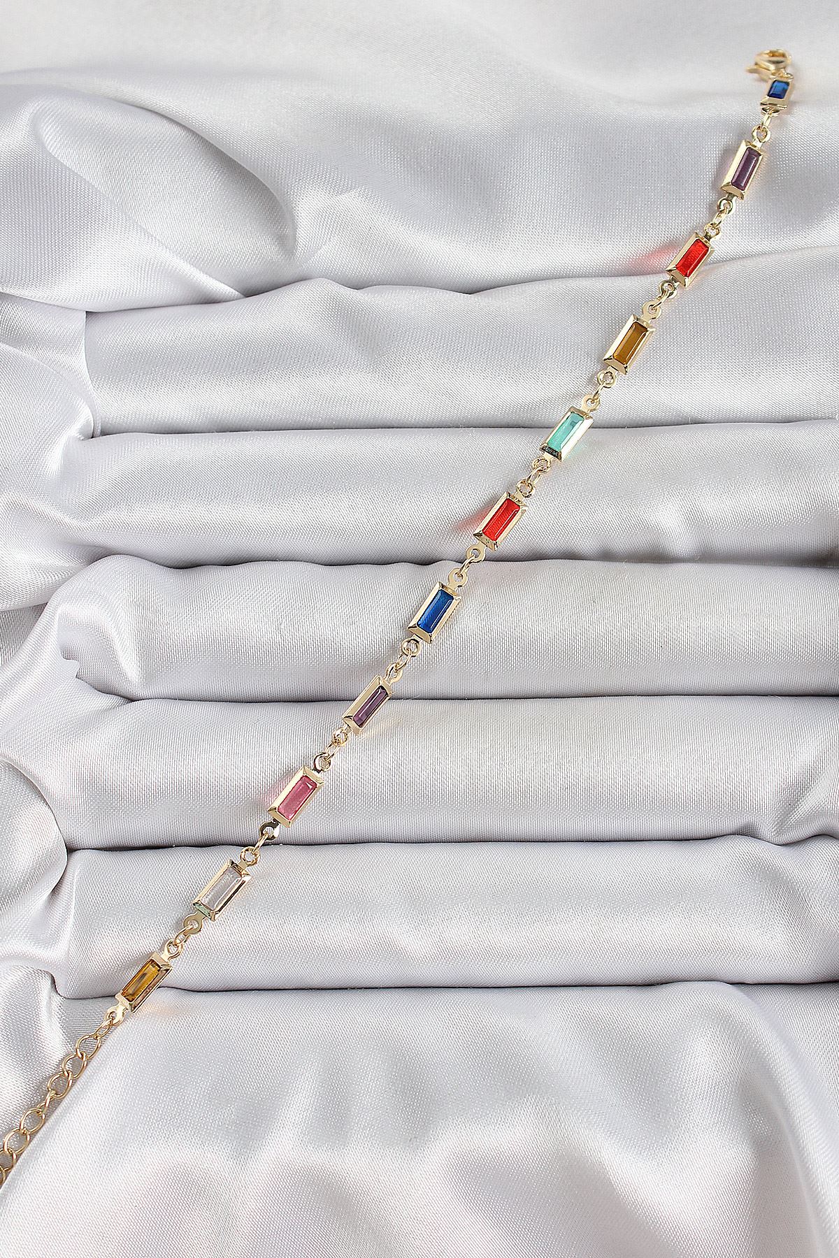Pirinç Gold Renk Karışık Renkli Kare Zirkon Taşlı Kadın Bileklik - TJ-BB7040
