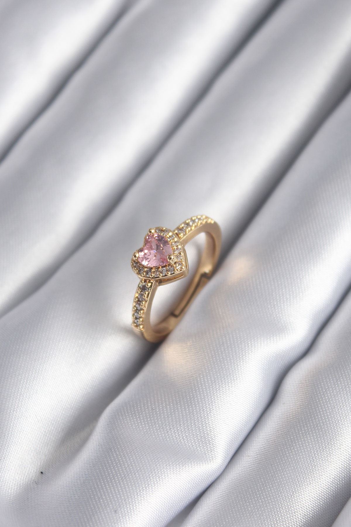 Pirinç Gold Renk Pembe Zirkon Taş Kalp Charm Model Kadın Yüzük - TJ-BYK2957