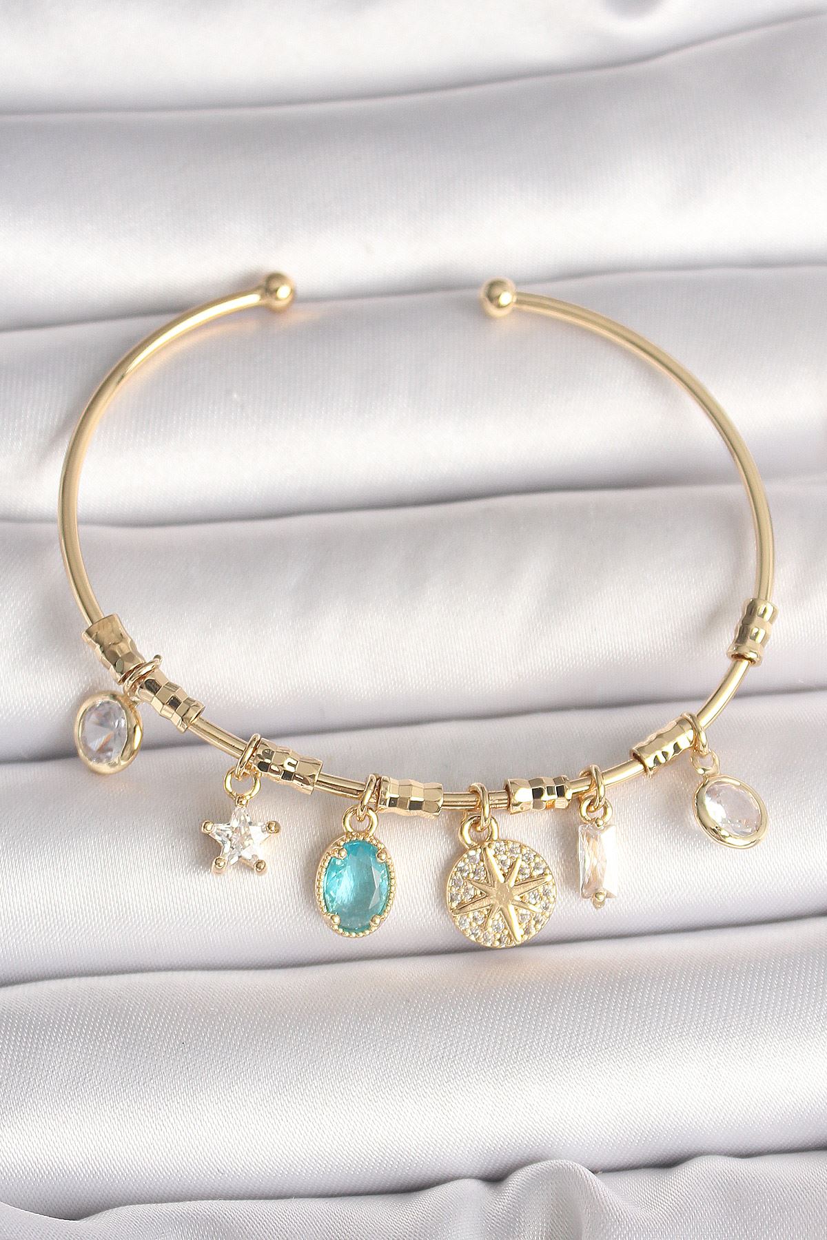 Pirinç Gold Renk Sallantı Zirkon Taş Detaylı Pusula Figür Charm Kadın Bileklik - TJ-BB6886