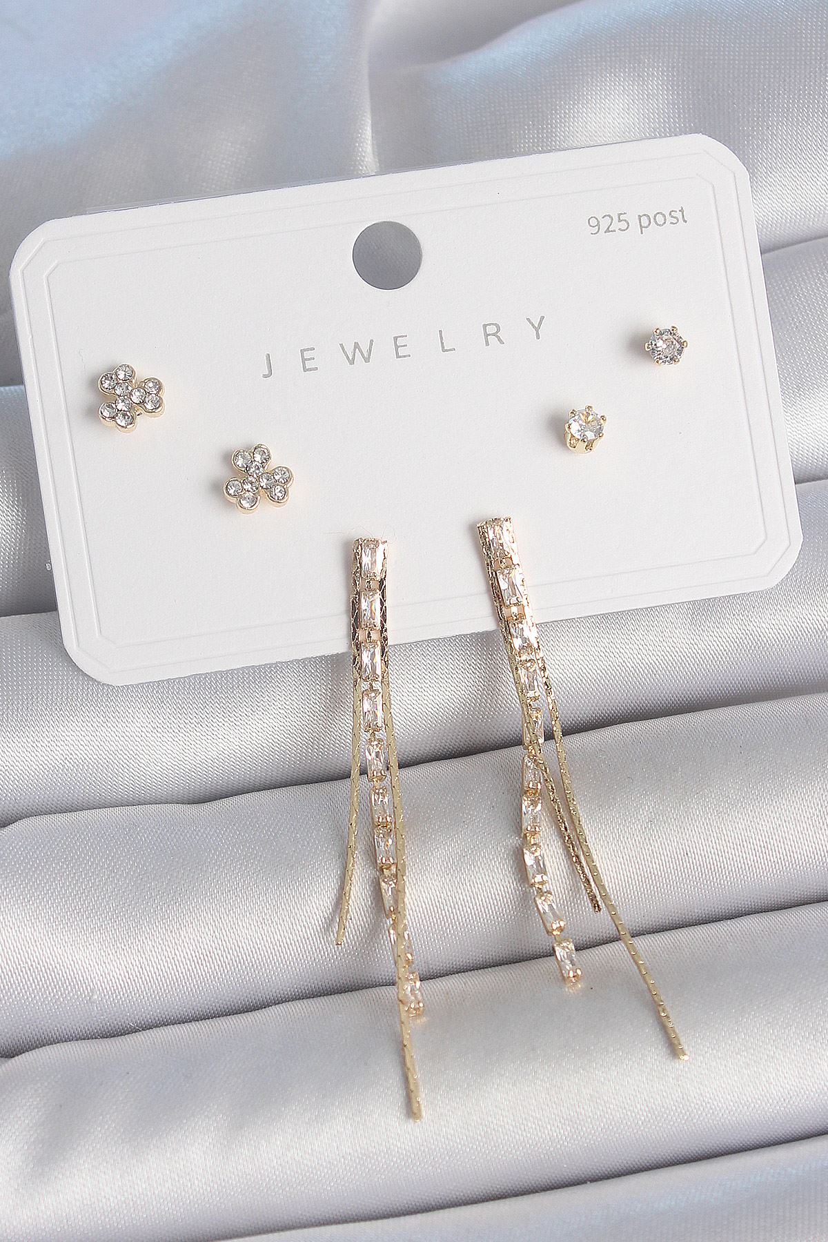 Pirinç Gold Renk Su Yolu Zirkon Taşlı Sallantı Model Çiçek Detay 925 Ayar Gümüş Çivi Kadın Küpe Seti - TJ-BKP10490