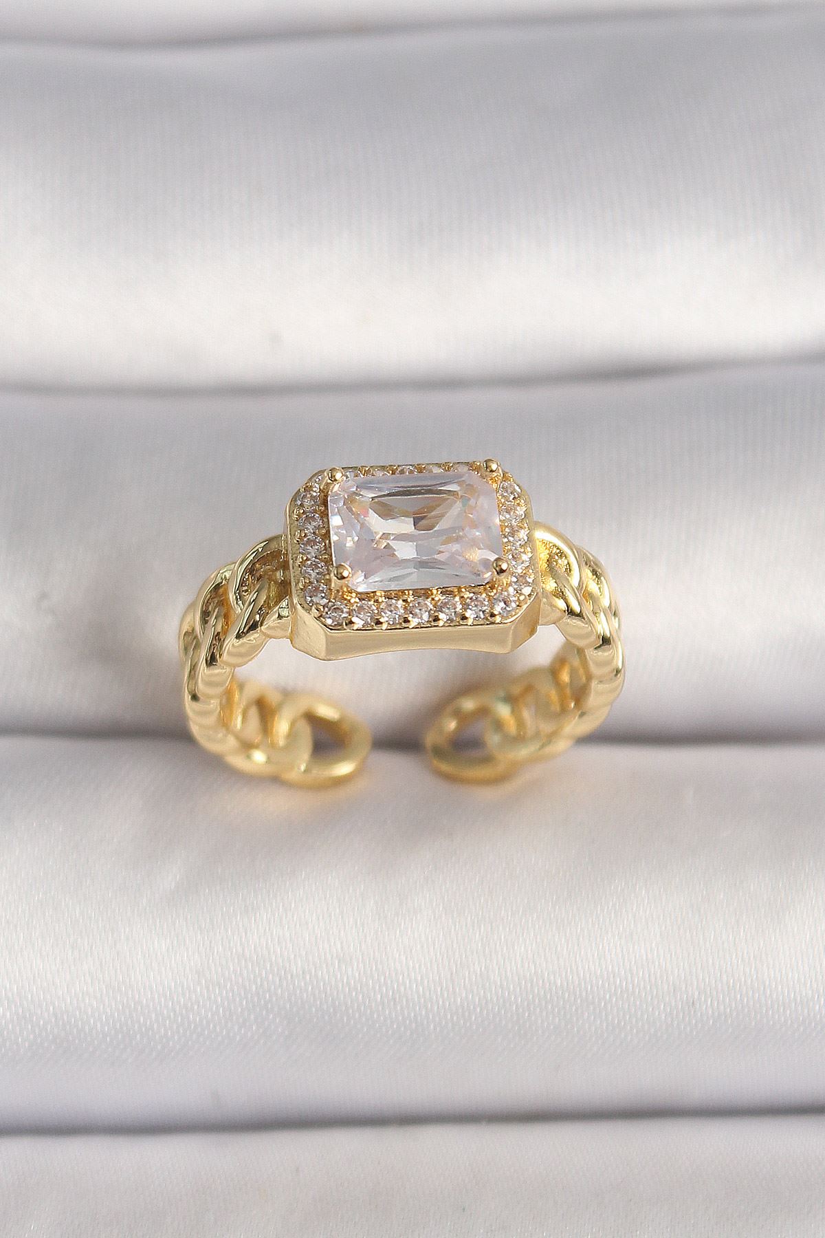 Pirinç Gold Renk Zincir Model Kare Zirkon Taşlı Kadın Yüzük - TJ-BYK3590