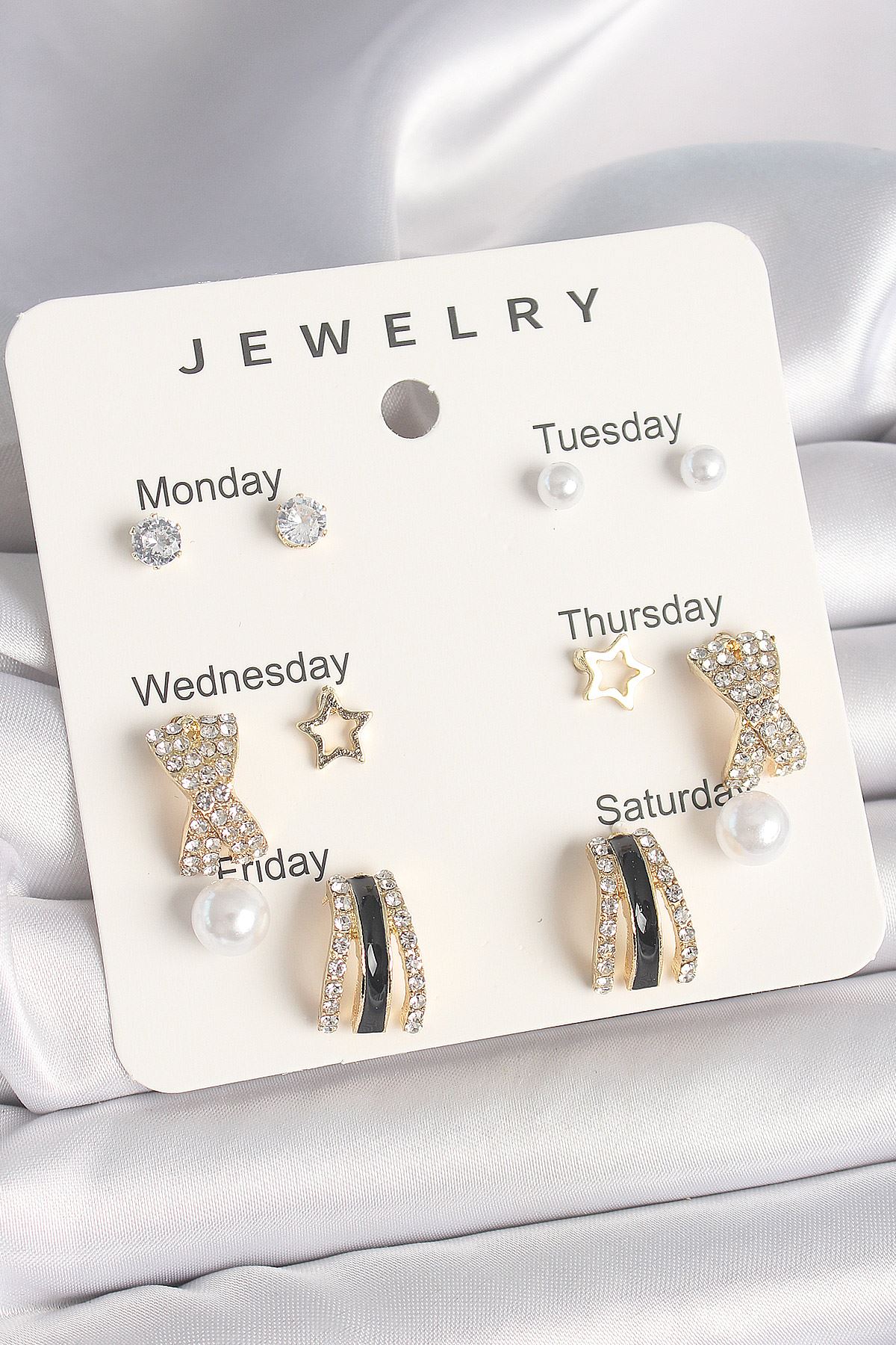 Pirinç Gold Renk Zirkon Taş Yıldız Detaylı İncili 7'Li Set Kadın Küpe Seti - TJ-BKP10320