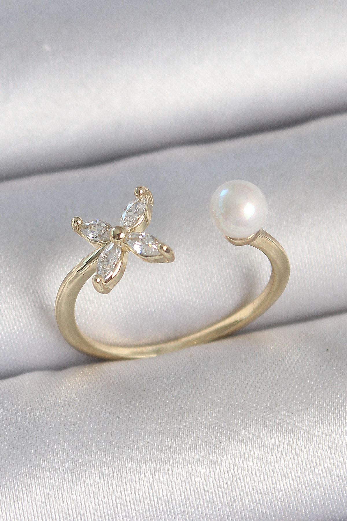Pirinç Gold Renk Zirkon Taşlı Çiçek Model İnci Detay Ayarlanabilir Kadın Yüzük - TJ-BYK3727