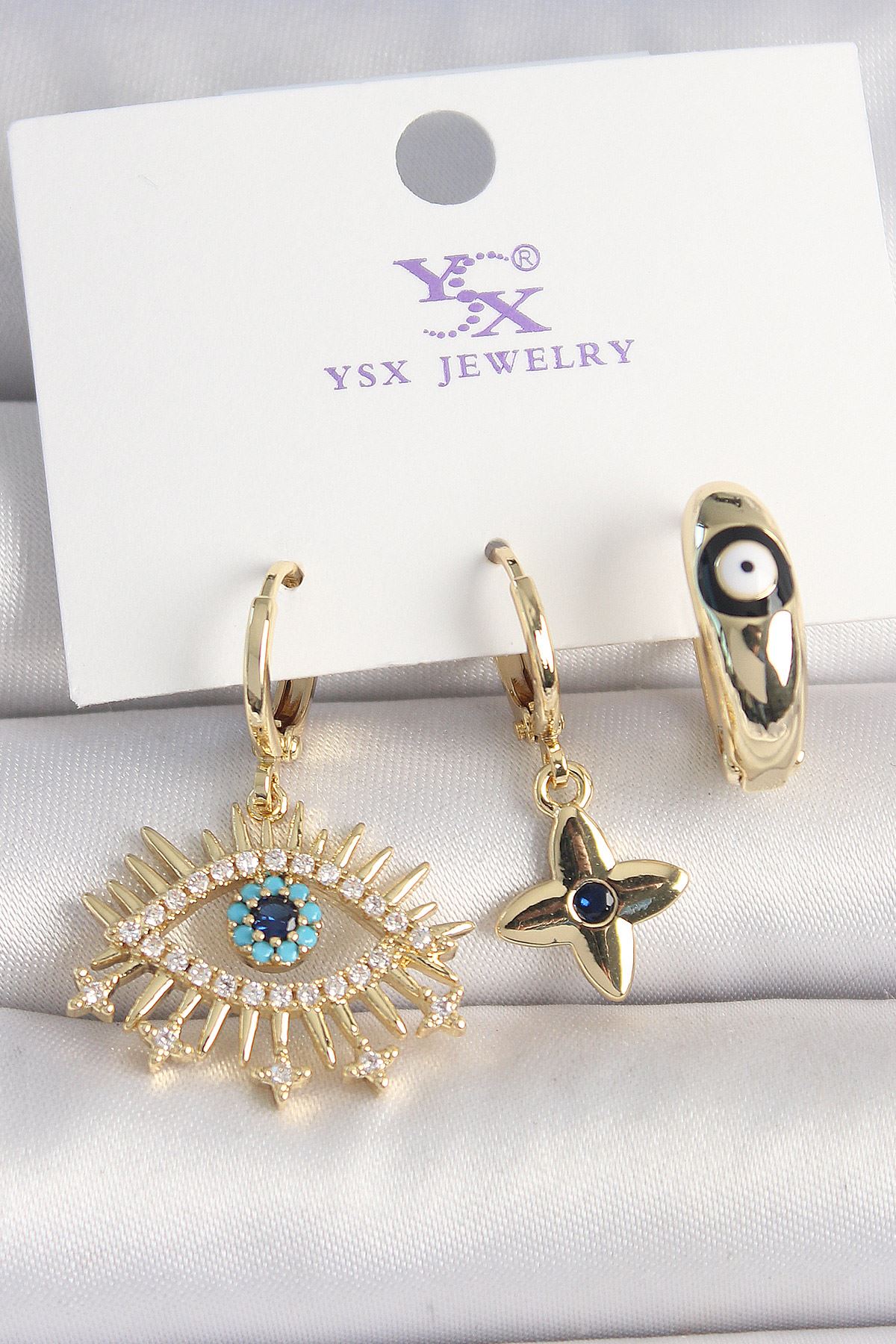 Pirinç Gold Renk Zirkon Taşlı Göz Figür Nazar Boncuk Detay 3'Lü Kadın Kombin Küpe - TJ-BKP10439