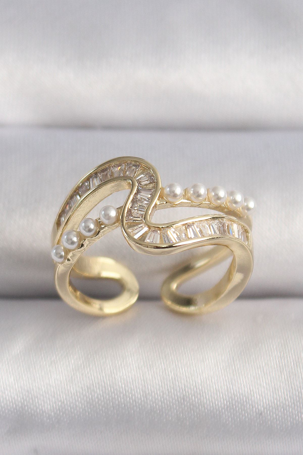 Pirinç Gold Renk Zirkon Taşlı İnci Detay VIP Seri Kadın Yüzük - TJ-BYK3512