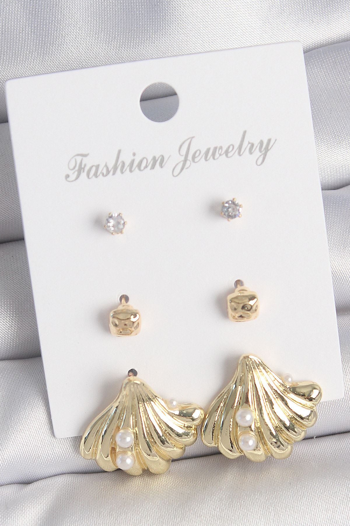 Pirinç Gold Renk Zirkon Taşlı İnci Detaylı Deniz Kabuğu Model 3 Çift Kadın Küpe Seti - TJ-BKP10617