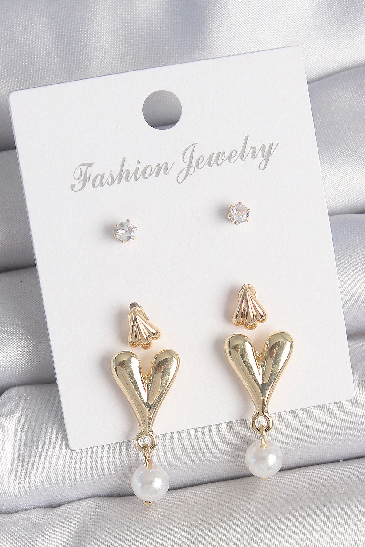 Pirinç Gold Renk Zirkon Taşlı İncili Sallantılı Kalp Model 3 Çift Kadın Küpe Seti - TJ-BKP10608