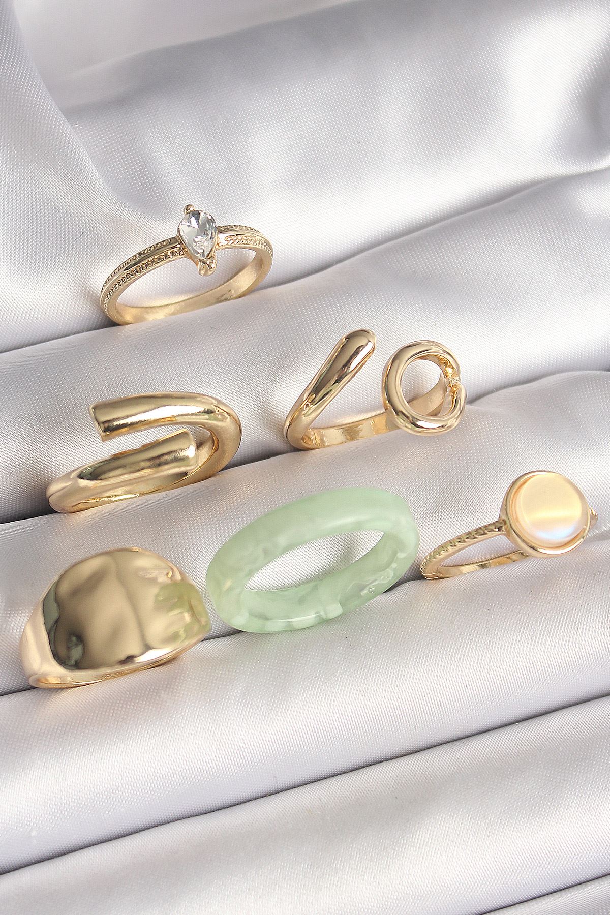 Pirinç Gold Renk Zirkon Taşlı İşleme Plaka Figürlü Beyaz Daire Mine Detaylı 6'Lı Kadın Yüzük Seti - TJ-BYK3633