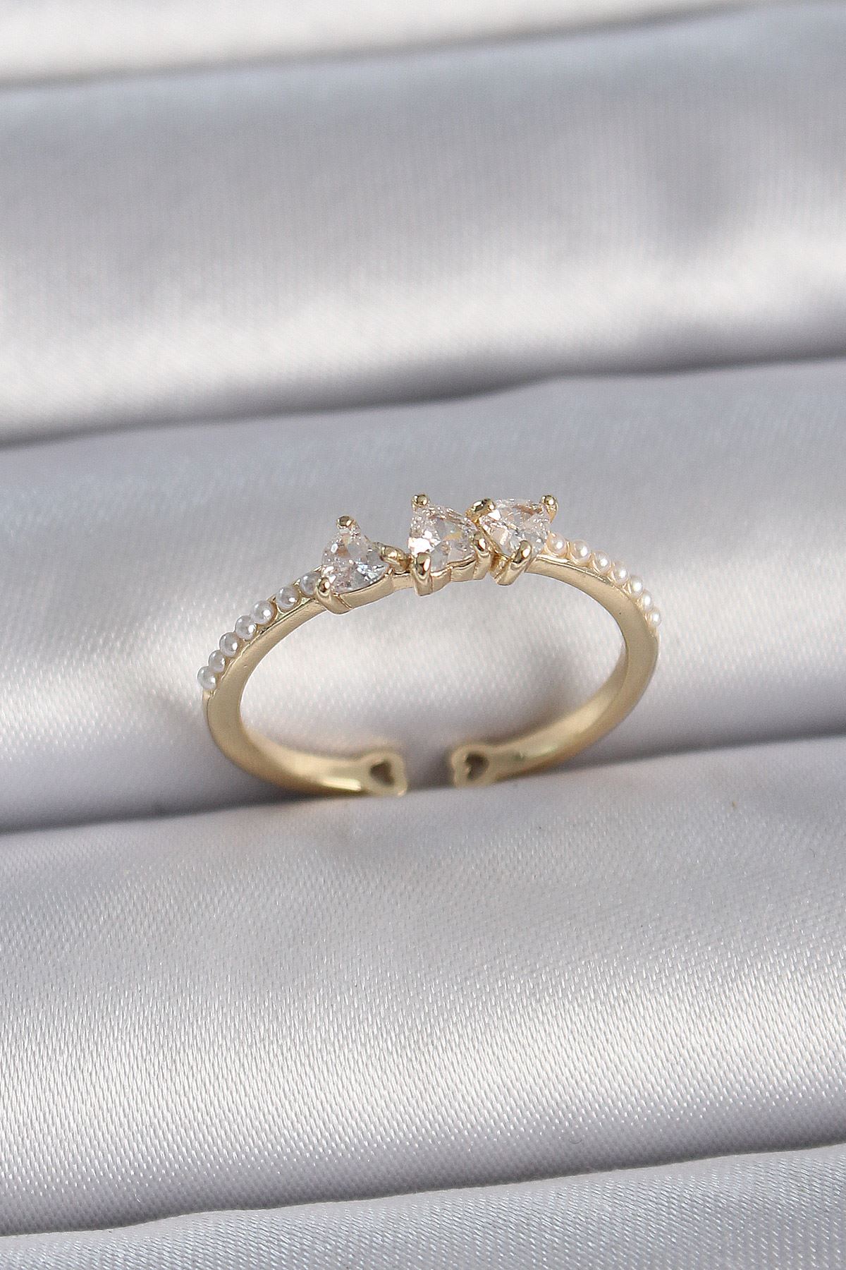 Pirinç Gold Renk Zirkon Taşlı Kalp İnci Detaylı Ayarlanabilir Model Kadın Yüzük - TJ-BYK3362