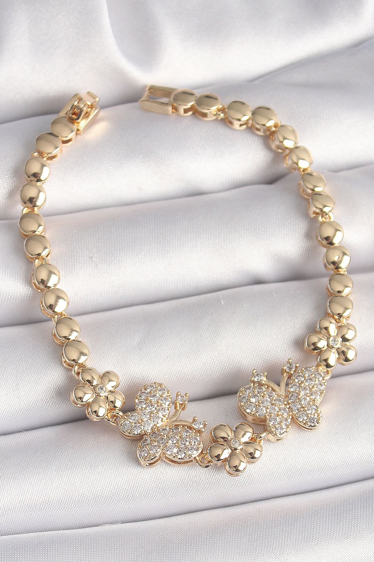 Pirinç Gold Renk Zirkon Taşlı Kelebek Figür Çiçek Zincir Model Kadın Bileklik - TJ-BB6826